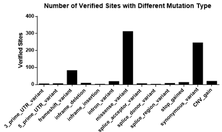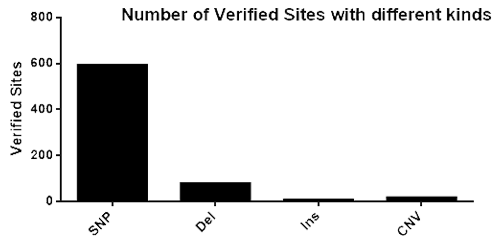 表1. 泛腫瘤相關(guān)靶向基因部分展示 3. 染色體全覆蓋,除了Y染色體外,其他染色體都有涉及; 圖1. 在不同染色體編號(hào)上的位點(diǎn)數(shù)(經(jīng)過(guò)驗(yàn)證的位點(diǎn)) 4. 變異種類(lèi)多:涉及SNP,deletion,insertion,CNV等等; 圖2. 不同種類(lèi)突變形式的位點(diǎn)數(shù)(經(jīng)過(guò)驗(yàn)證的位點(diǎn)) 5. 突變頻率全覆蓋,從1%-100%,各區(qū)間都有涉及; 圖3. 不同突變頻率的位點(diǎn)數(shù)(經(jīng)過(guò)驗(yàn)證的位點(diǎn)) 6. 突變類(lèi)型全覆蓋,有UTR區(qū)域,有內(nèi)含子,有外顯子,有錯(cuò)義突變,有同義突變,有供體變異等等; 圖4. 突變細(xì)分種類(lèi)的位點(diǎn)數(shù)(經(jīng)過(guò)驗(yàn)證的位點(diǎn)) 7. 位點(diǎn)多,超過(guò)680個(gè)位點(diǎn),全部有對(duì)應(yīng)的Cosmic ID或/和dbSNP ID注釋?zhuān)?/span> 圖5. 經(jīng)過(guò)dbSNP ID和Cosmic ID注釋的位點(diǎn)數(shù)(經(jīng)過(guò)驗(yàn)證的位點(diǎn)) 8. 多平臺(tái)驗(yàn)證,數(shù)據(jù)準(zhǔn)確可信賴(lài); 8.1 其中1000x panel驗(yàn)證16個(gè)位點(diǎn),panel為知名商業(yè)化公司產(chǎn)品; 表2. 16個(gè)經(jīng)過(guò)1000x NGS-Panel試劑盒驗(yàn)證的位點(diǎn)信息 8.2 DdPCR驗(yàn)證8個(gè)位點(diǎn),Bio-Rad QX200和Bio-Rad原裝試劑 表3. 8個(gè)經(jīng)過(guò)DdPCR(bio-rad)試劑盒驗(yàn)證的位點(diǎn)信息 8.3 500X WES驗(yàn)證所有位點(diǎn),IDT xGenExome Research Panel v1.0捕獲,HiSeq X-TEN測(cè)序 表4. 500X WES驗(yàn)證的400個(gè)基因信息 9. 基因覆蓋科學(xué),超過(guò)400個(gè)基因,覆蓋國(guó)內(nèi)外多個(gè)知名panel的設(shè)計(jì); 表5. 基因覆蓋率比較 免費(fèi)試用活動(dòng)開(kāi)始了,感興趣的親們可以聯(lián)系我們4008-750-250 |