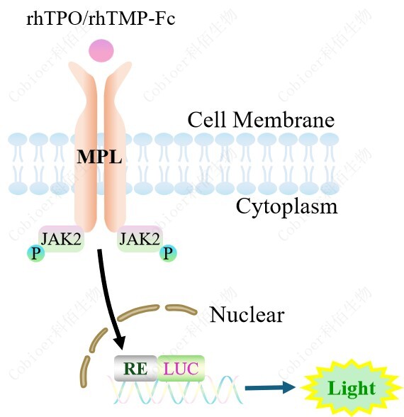 TPO Effector Reporter Cell 報告基因藥靶模型很好的模擬了體內(nèi) TPO 的信號轉(zhuǎn)導過程, 原理見下圖所示。![]() Figure 1. TPO Effector Reporter Cell 細胞模型原理圖 |