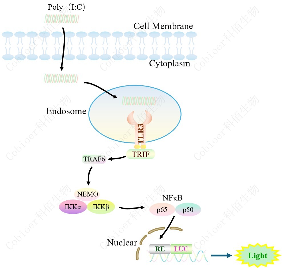 TLR3 NFκB-Luc HEK293 報告基因藥靶模型很好的模擬了體內(nèi) TLR3 的信號轉(zhuǎn)導(dǎo)過程, 原理見下圖所示。