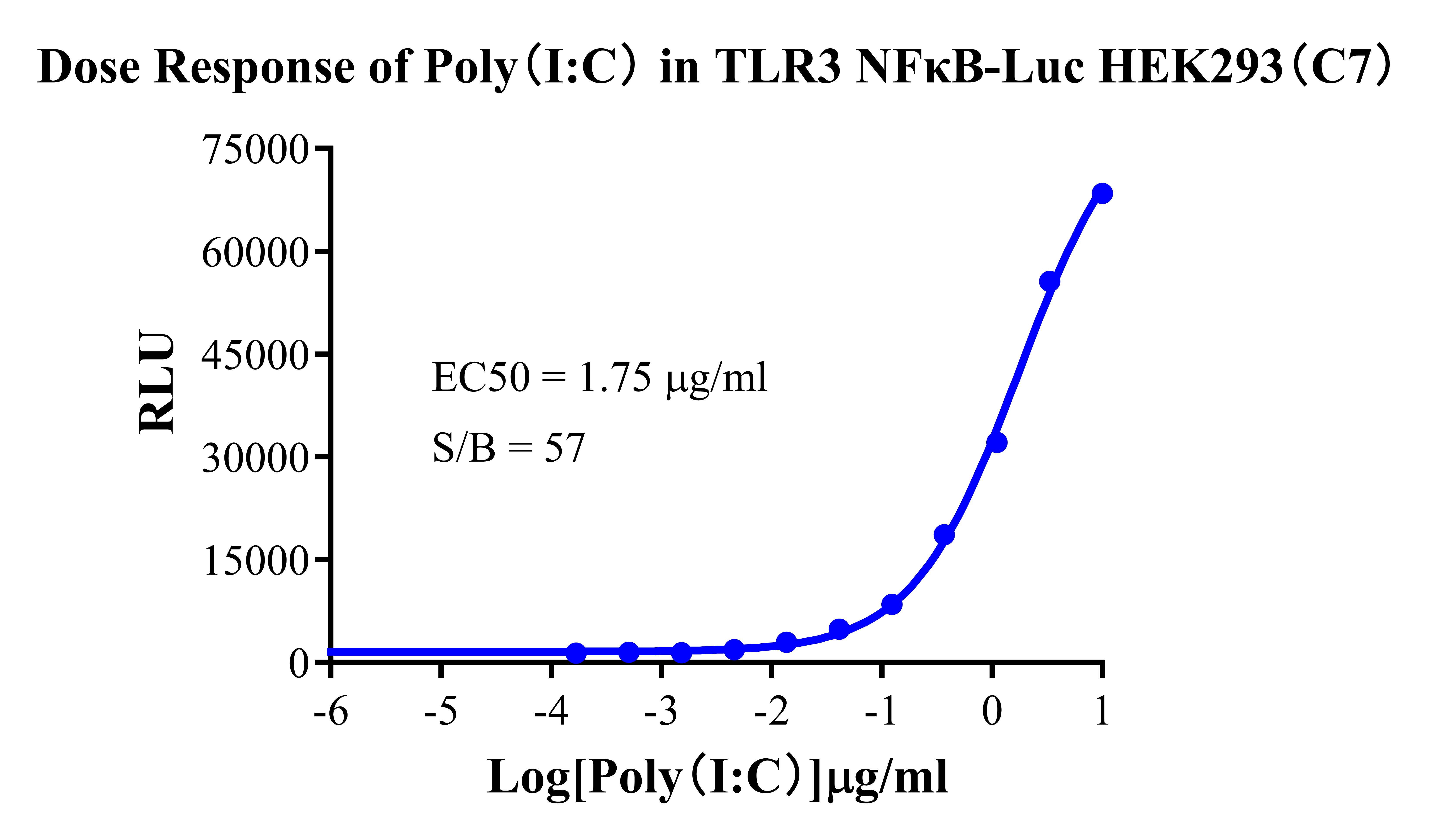 Figure 1. Detect Luciferase assay by Ultra Luciferase Detection Kit CBPH0001(we strongly suggest to purchase from Cobioer). Dose Response of Poly(I:C) in TLR3 NFκB-Luc HEK293(C7).