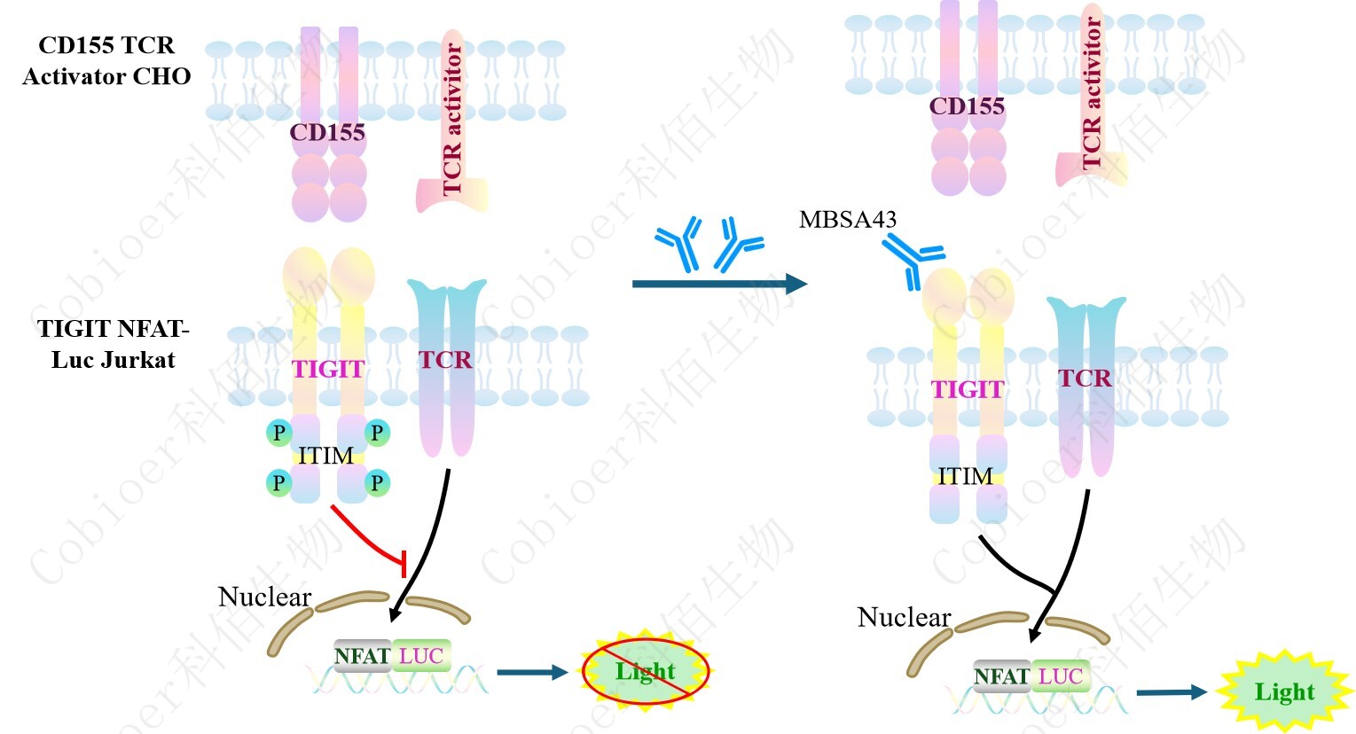 TIGIT NFAT-Luc Jurkat 報(bào)告基因藥靶模型很好的模擬了體內(nèi) TIGIT 的信號(hào)轉(zhuǎn)導(dǎo)過(guò)程, 原理見(jiàn)下圖所示。