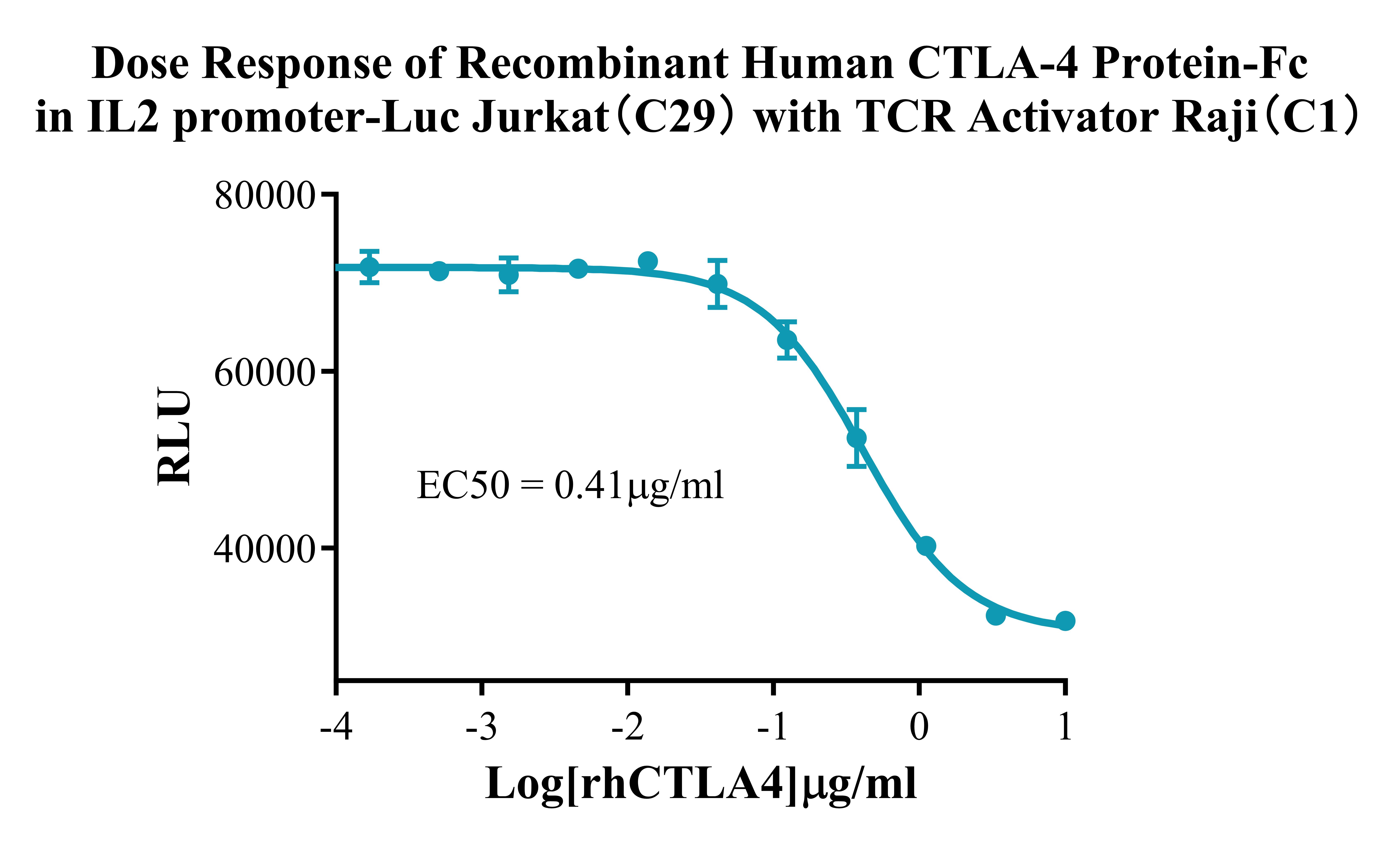 Figure 4. Dose Response of Recombinant Human CTLA-4 Protein-Fc in IL2 Promoter Reporter-Jurkat (C29)with TCR Activitor Raji (C1).