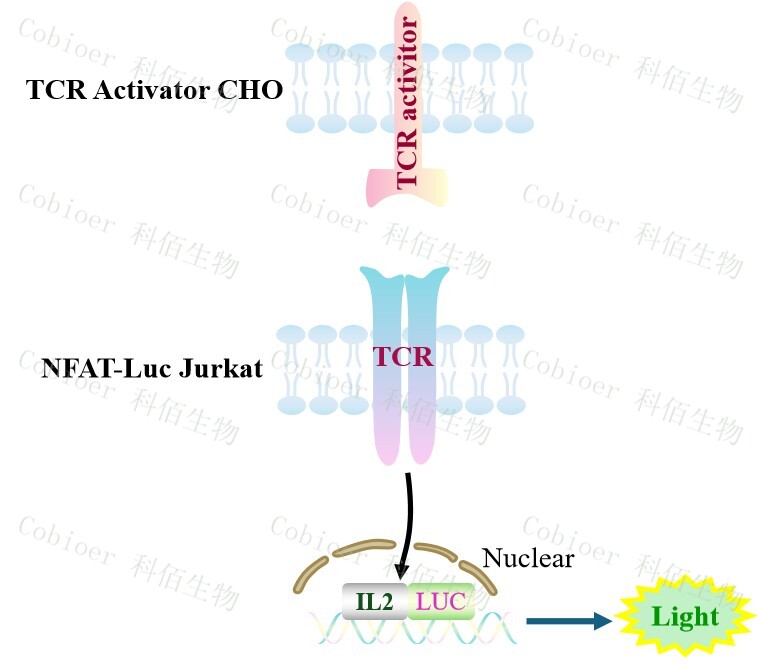 TCR Activator CHO 報(bào)告基因藥靶模型很好的模擬了體內(nèi) TCR 的信號轉(zhuǎn)導(dǎo)過程,原理見下圖所示。