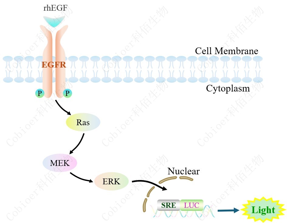 SRE-Luc HEK293 報告基因細胞是由 SRE 調(diào)控并表達 Luc 熒光素酶報 告基因的 HEK293 細胞。EGF 與受體結(jié)合,激活 SRE 的原理見下圖所示。