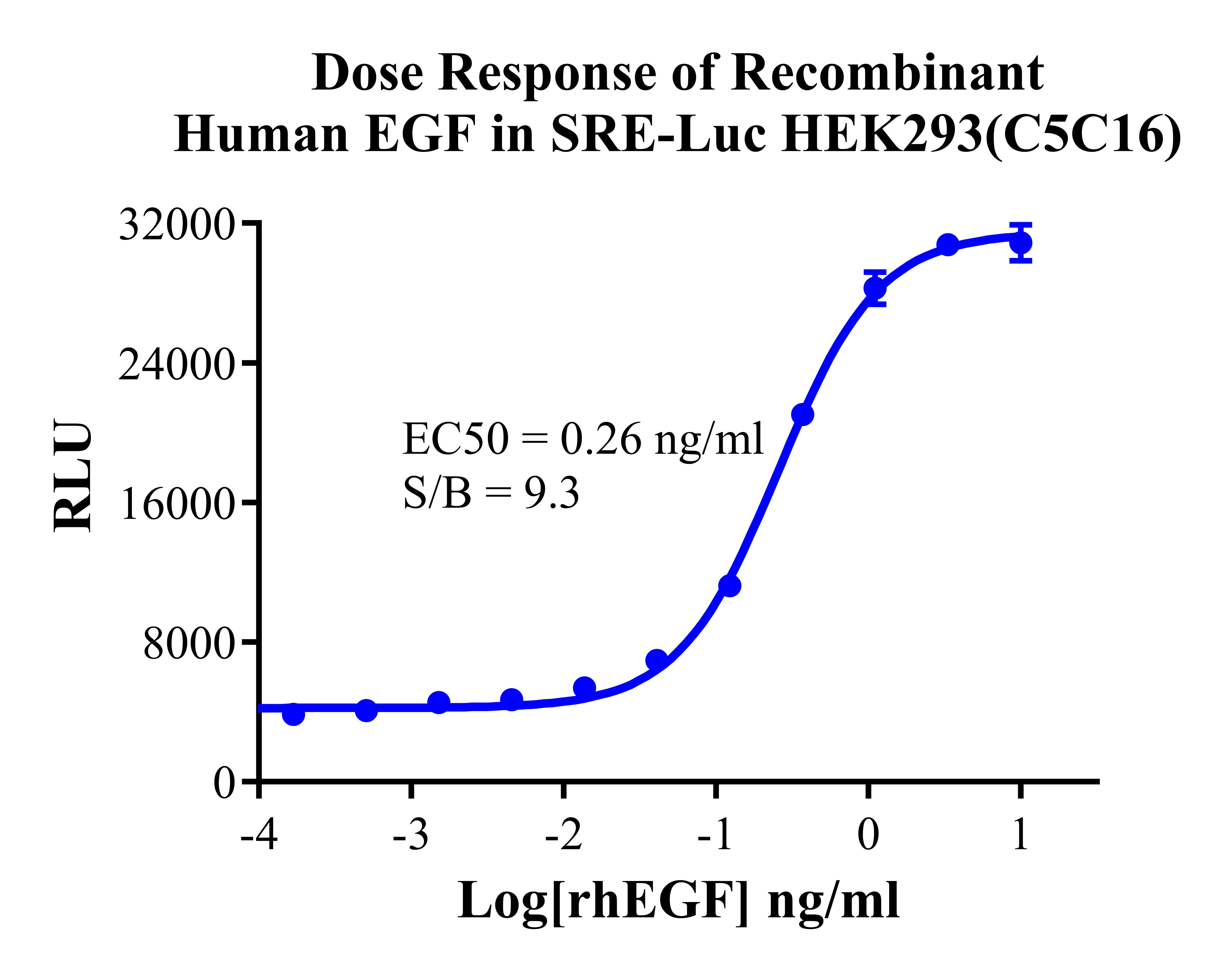 Figure 2. Detect Luciferase assay by Ultra Luciferase Detection Kit CBPH0001(we strongly suggest to purchase from Cobioer). Dose Response of Recombinant Human EGF in SRE-Luc HEK293 Cells (C5C16).