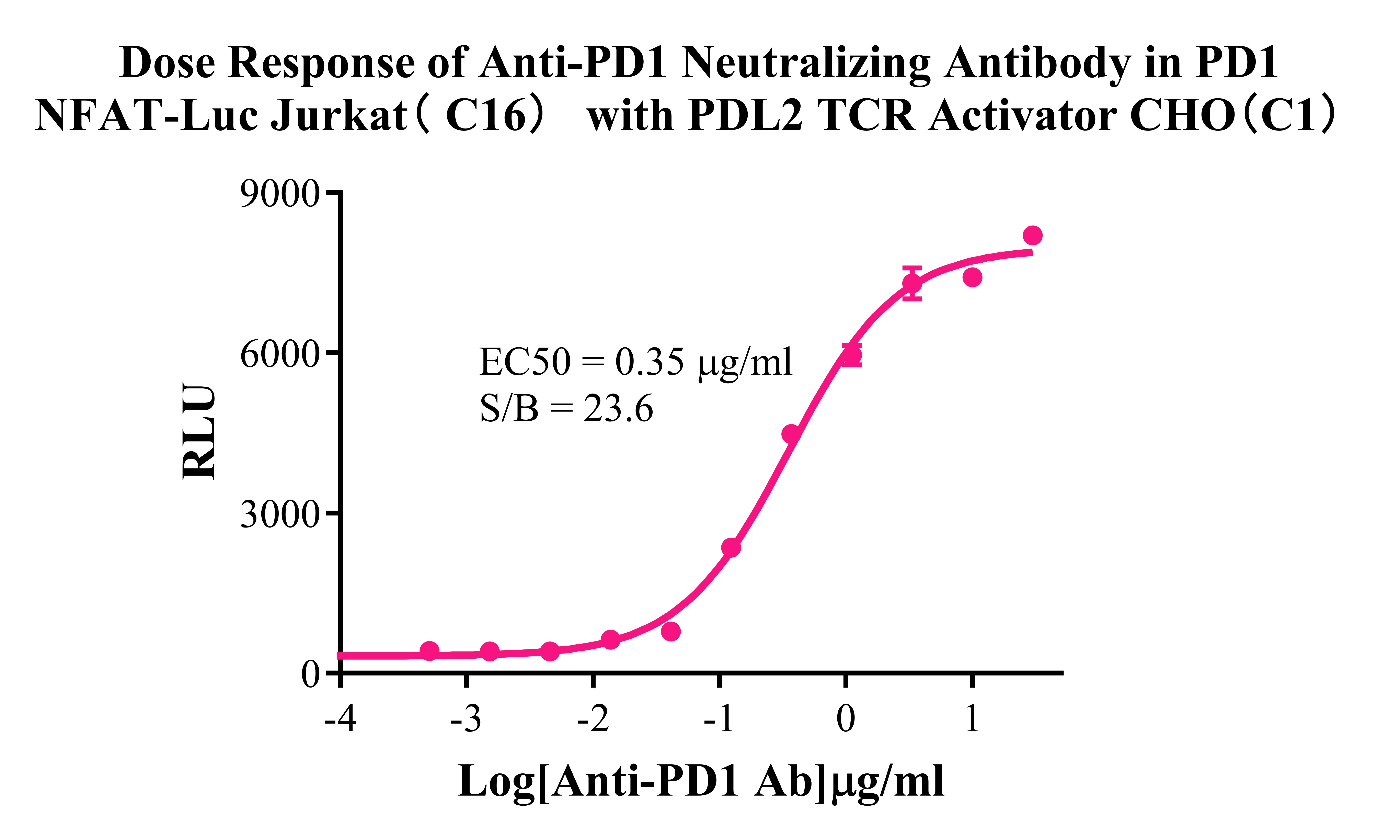 Figure 3. Detect Luciferase assay by Ultra Luciferase Detection Kit CBPH0001(we strongly suggest to purchase from Cobioer).Dose response of Anti-PD-1 Neutralizing Antibody in PD1 NFAT-Luc Jurkat(C16) with PDL1 TCR Activator CHO (C5). |