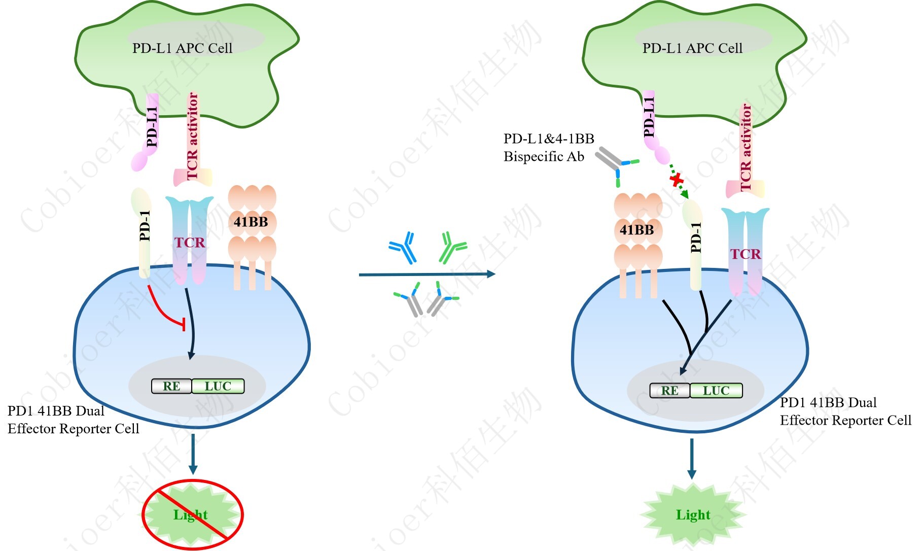 PD1 4-1BB Dual Effector Reporter Cell 報告基因藥靶模型很好的模擬了體內 PD1&4- 1BB 的信號轉導過程,原理見下圖所示。