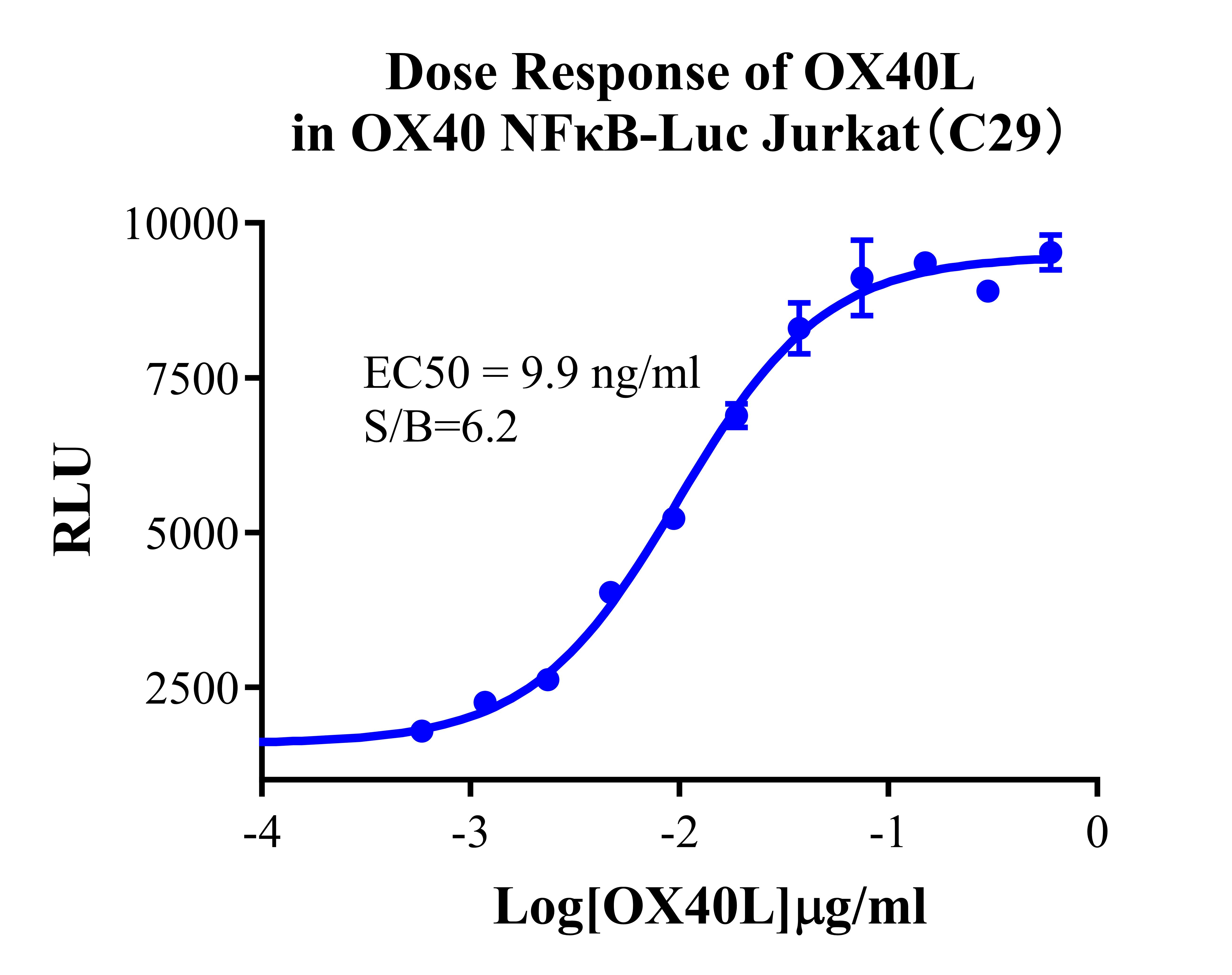 Figure 3. Detect Luciferase assay by Ultra Luciferase Detection Kit CBPH0001(we strongly suggest to purchase from Cobioer). Dose response of OX40L in OX40 NFκB-Luc Jurkat(C29).