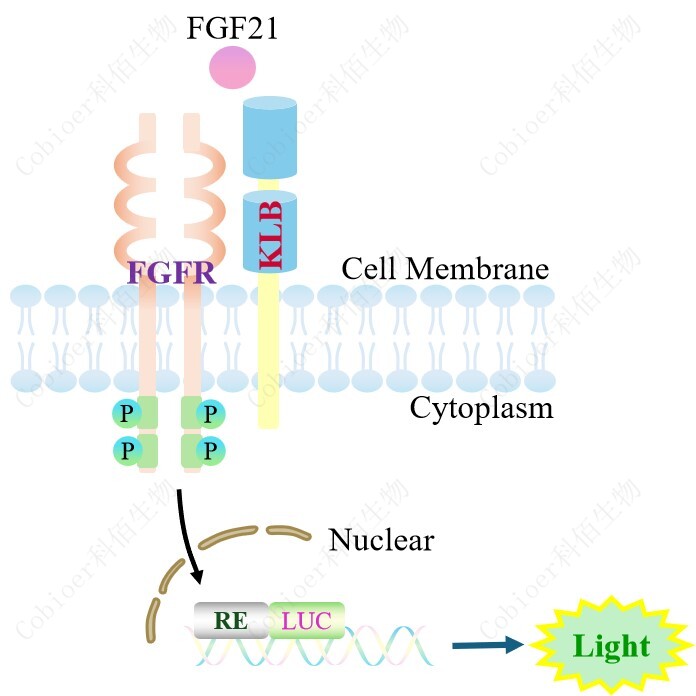 KLB Effector Reporter Cell 報告基因藥靶模型很好的模擬了體內(nèi) KLB 的信號轉(zhuǎn)導過程, 原理見下圖所示。 ![]() Figure 1. KLB Effector Reporter Cell 細胞模型原理圖