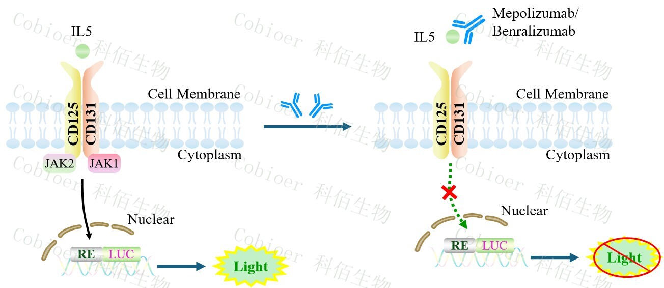 IL5 Effector Reporter Cell 報告基因藥靶模型很好的模擬了體內(nèi) IL5 的信號轉(zhuǎn)導(dǎo)過程, 原理見下圖所示。