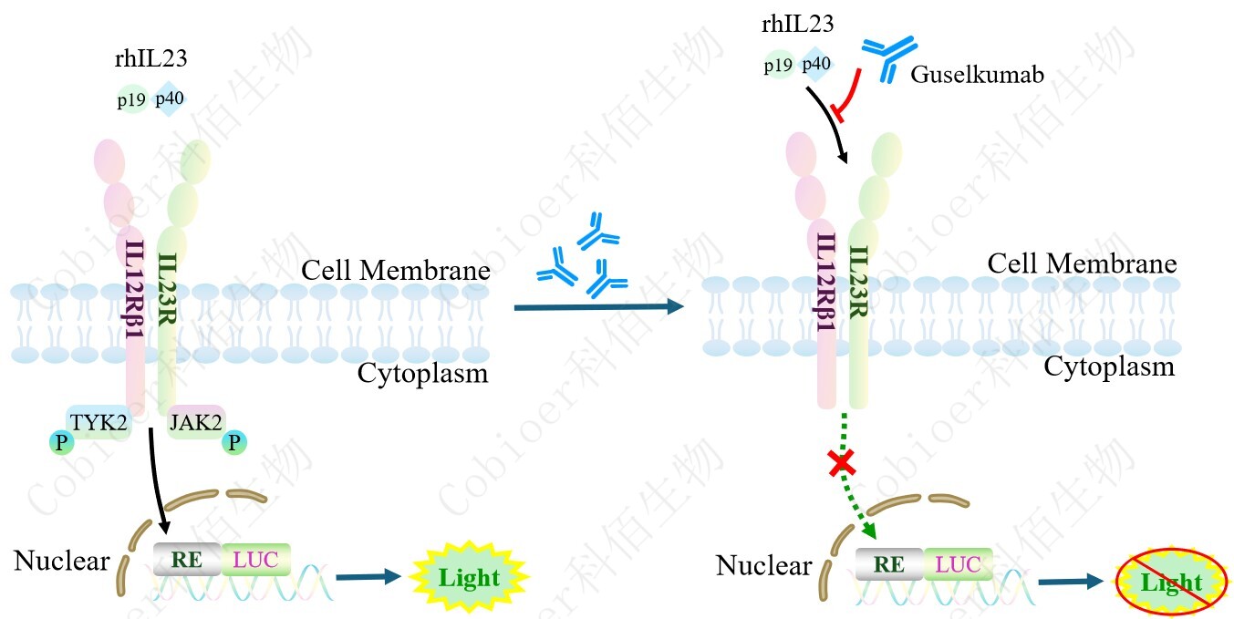 IL23 Effector Reporter Cell 報告基因藥靶模型很好的模擬了體內(nèi) IL23 的信號轉(zhuǎn)導過程, 原理見下圖所示。