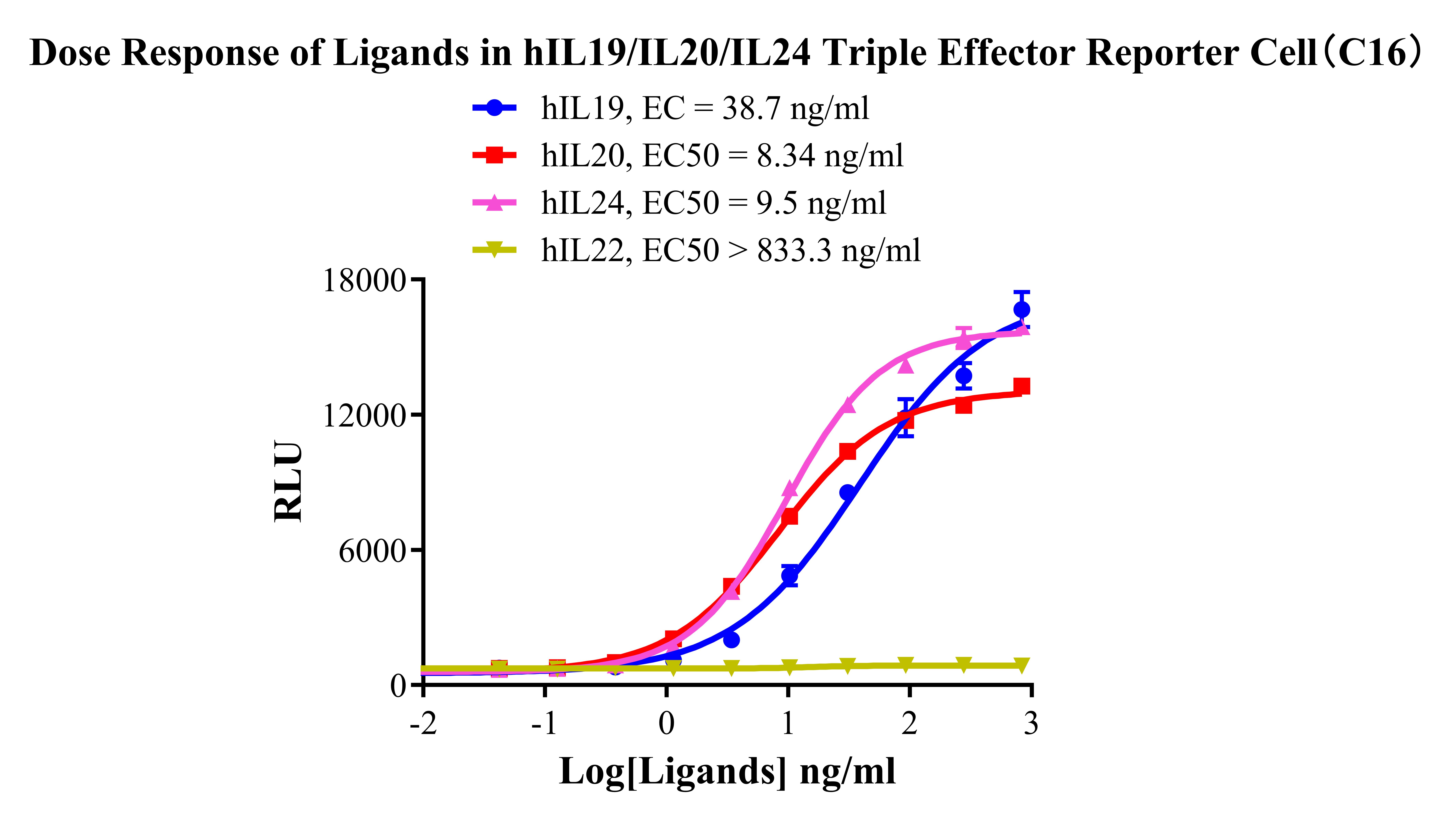 Figure 2. Dose Response of Ligands in hlL19/IL20/IL24 Triple Effector Reporter Cell (C16).