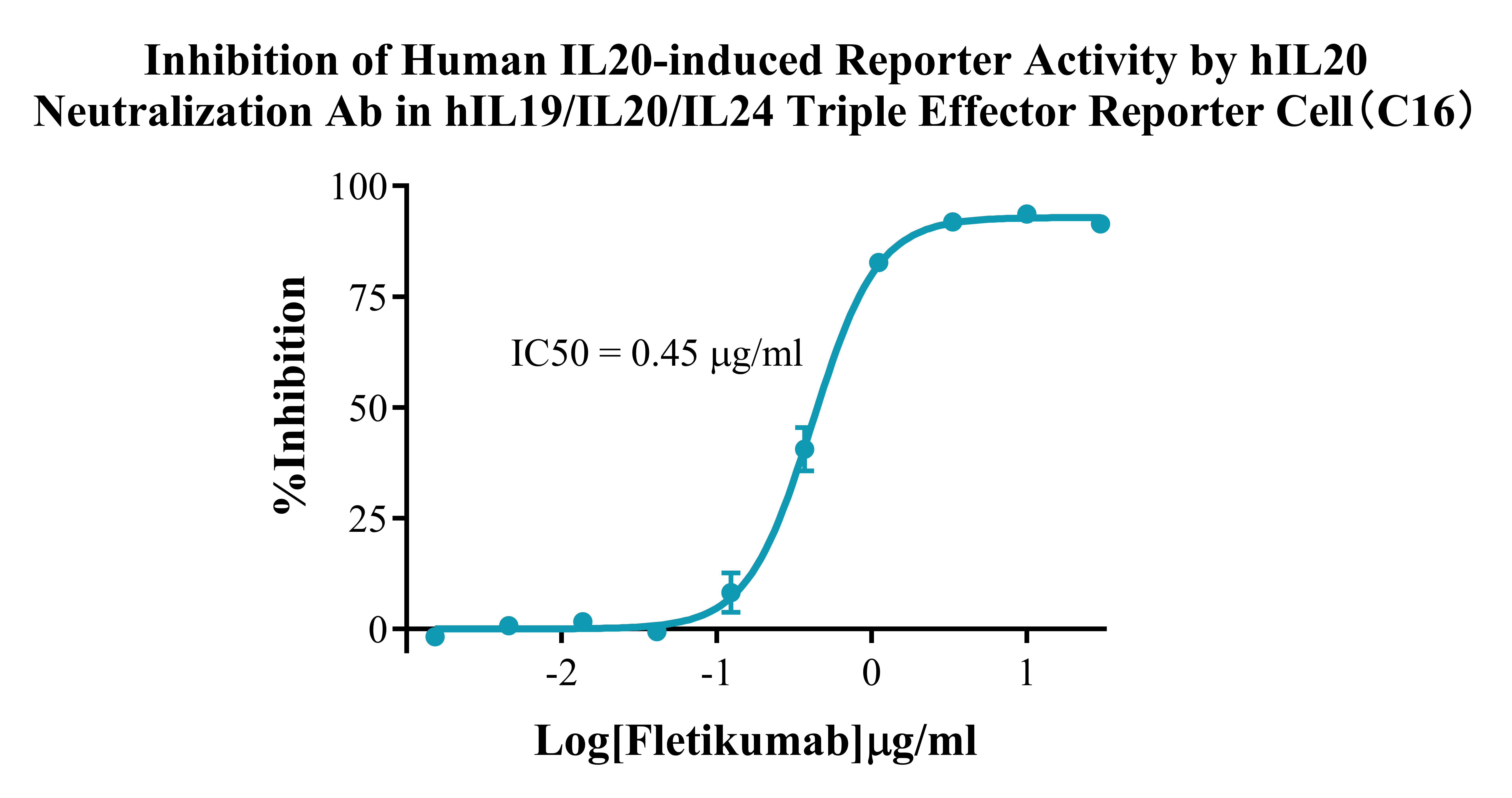 Figure 3. Inhibition of Human lL20-induced Reporter Activity by hlL20 Neutralization Ab in hlL19/lL20/IL24 Triple Effector Reporter Cell (C16).