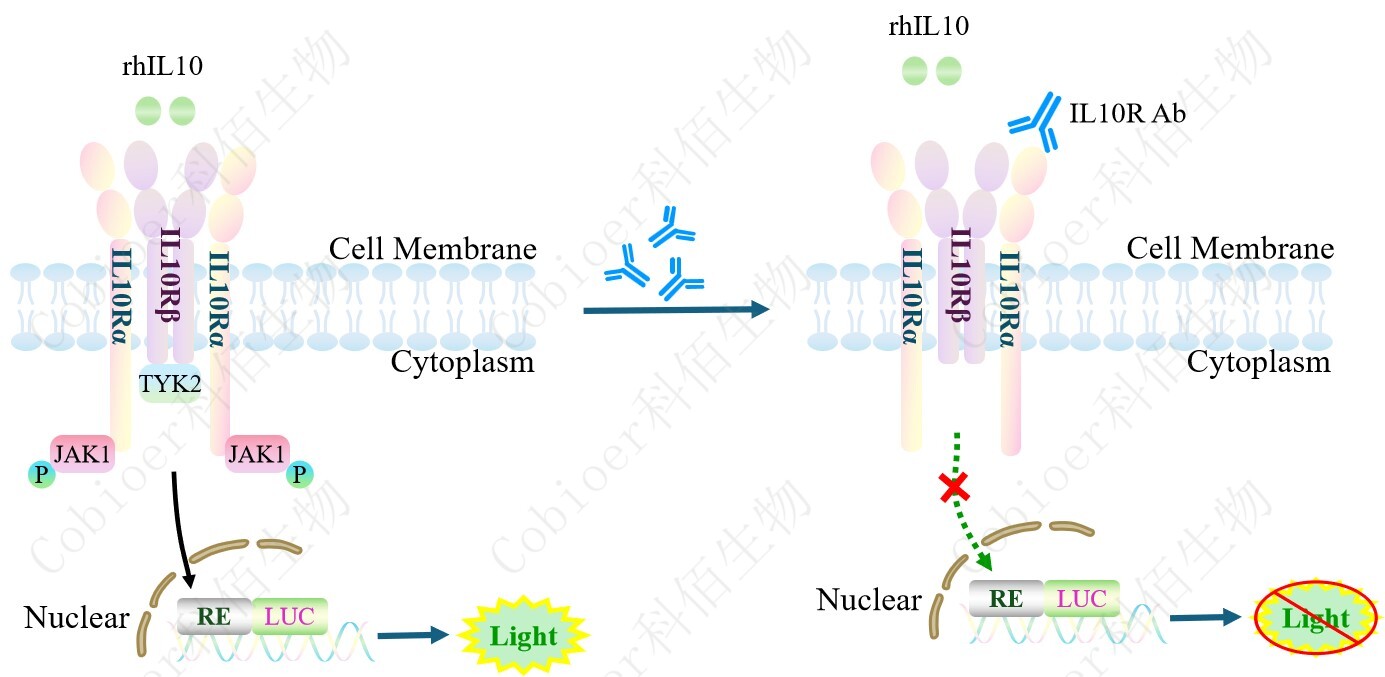 IL10 Effector Reporter Cell 報告基因藥靶模型很好的模擬了體內(nèi) IL10 的信號轉導過程, 原理見下圖所示。![]() Figure 1. IL10 Effector Reporter Cell 細胞模型原理圖