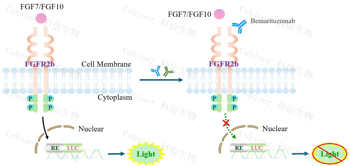 FGFR2b Effector Reporter Cell 報告基因藥靶模型很好的模擬了體內 FGFR2b 的信號轉 導過程,原理見圖 所示。