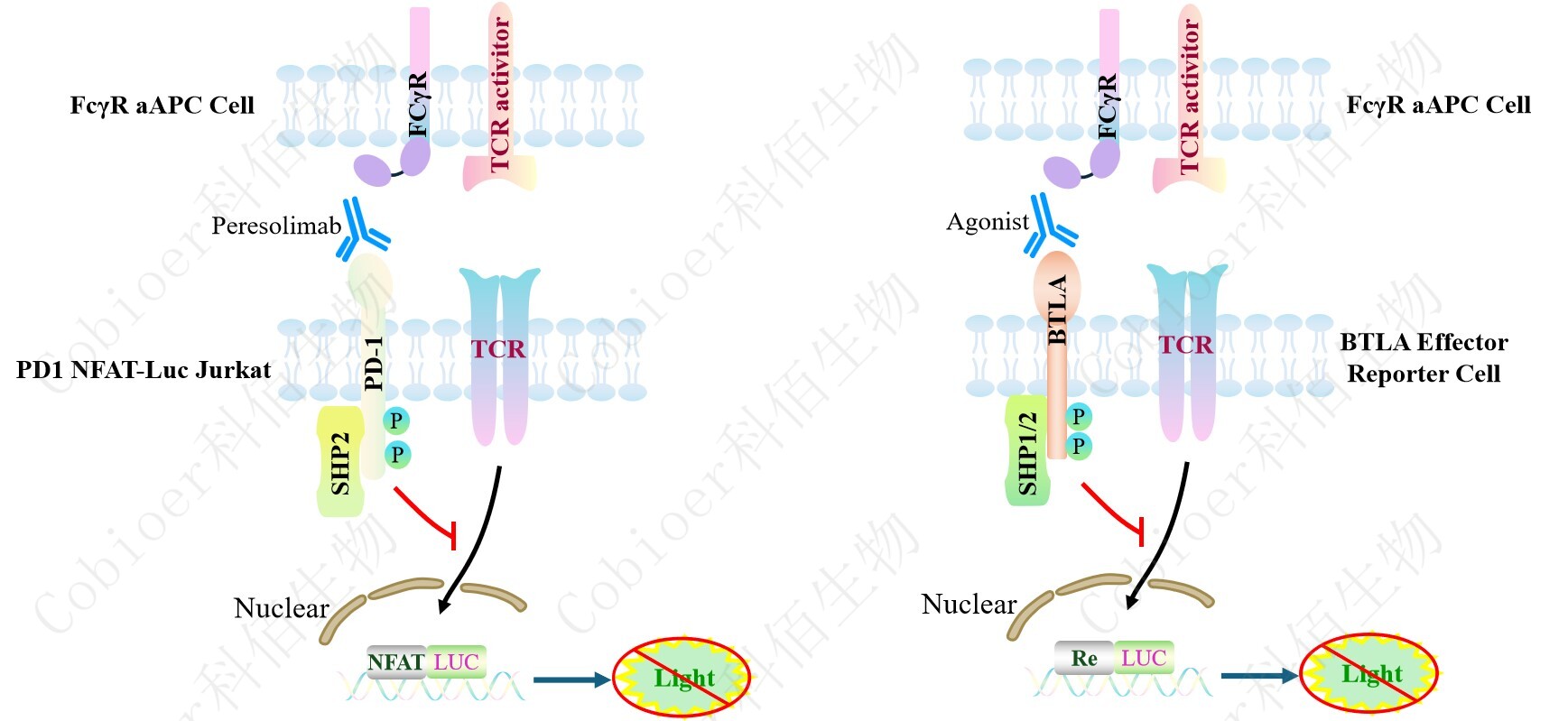 FcγR aAPC Cell在基礎細胞上穩(wěn)定表達 FcγR 和 aAPC。FcγR aAPC Cell 作為 PD1 NFAT-Luc Jurkat Cell/BTLA Effector Reporter Cell 的靶細胞進行功能檢測的原 理圖見下圖所示。