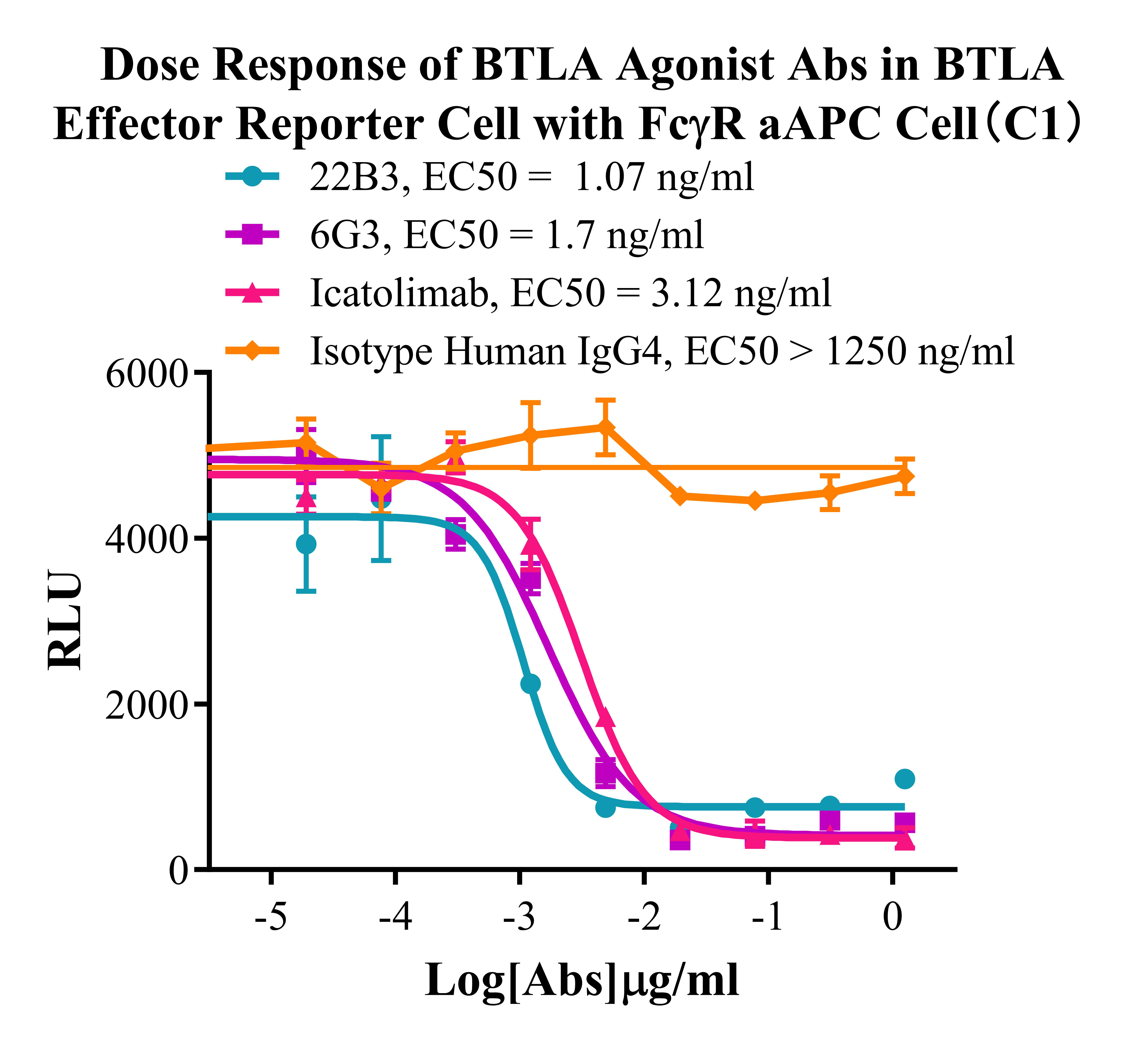 Figure 3. Dose Response of BTLA Agonist Abs in BTLA Effector Reporter Cells With FCγR aAPC Cell(C1).