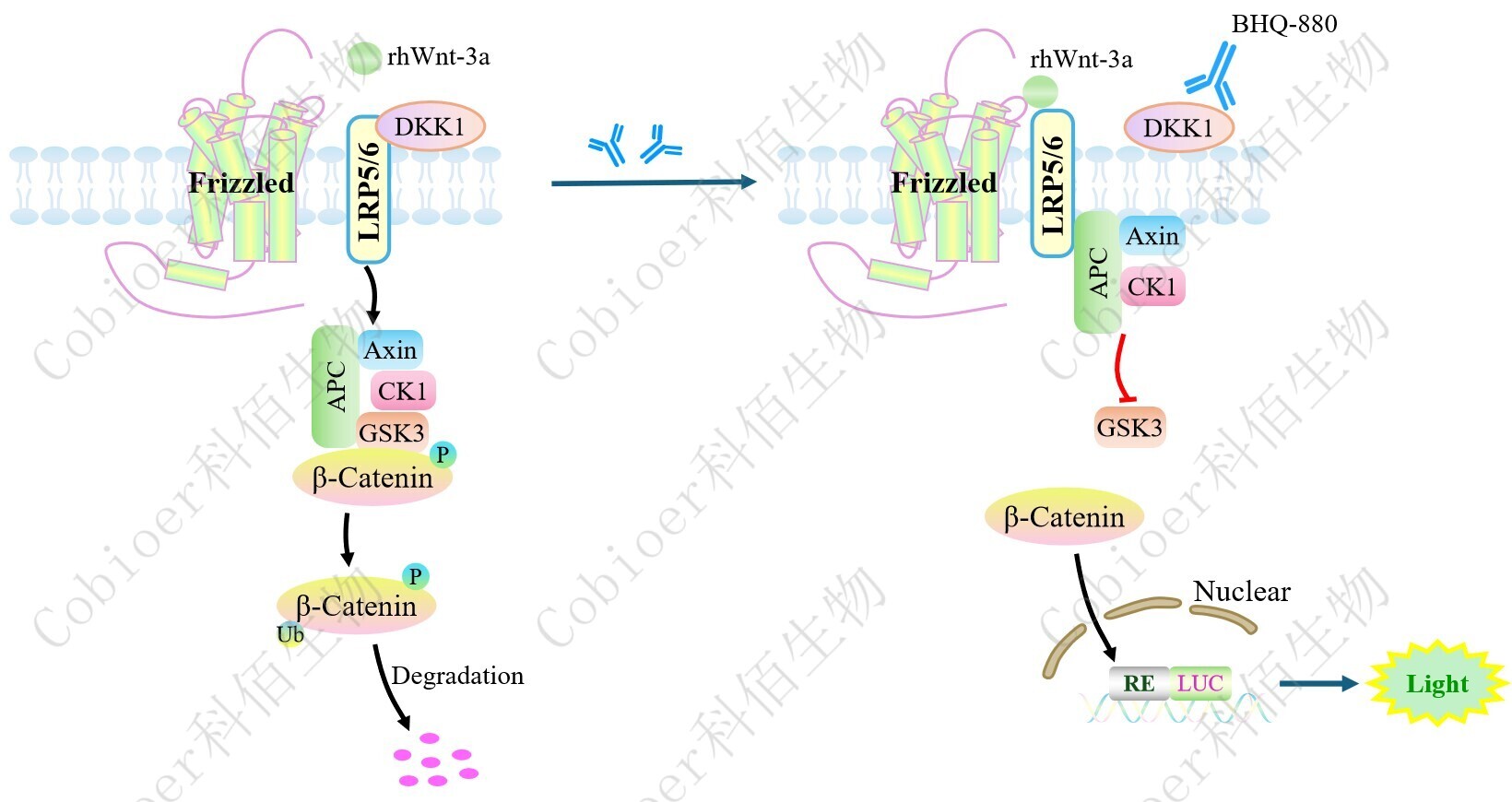 DKK1 Effector Reporter Cell 報告基因藥靶模型很好的模擬了體內(nèi) WNT 的信號轉導過程,原理見下圖所示。![]() Figure 1. DKK1 Effector Reporter Cell 模型原理圖 |