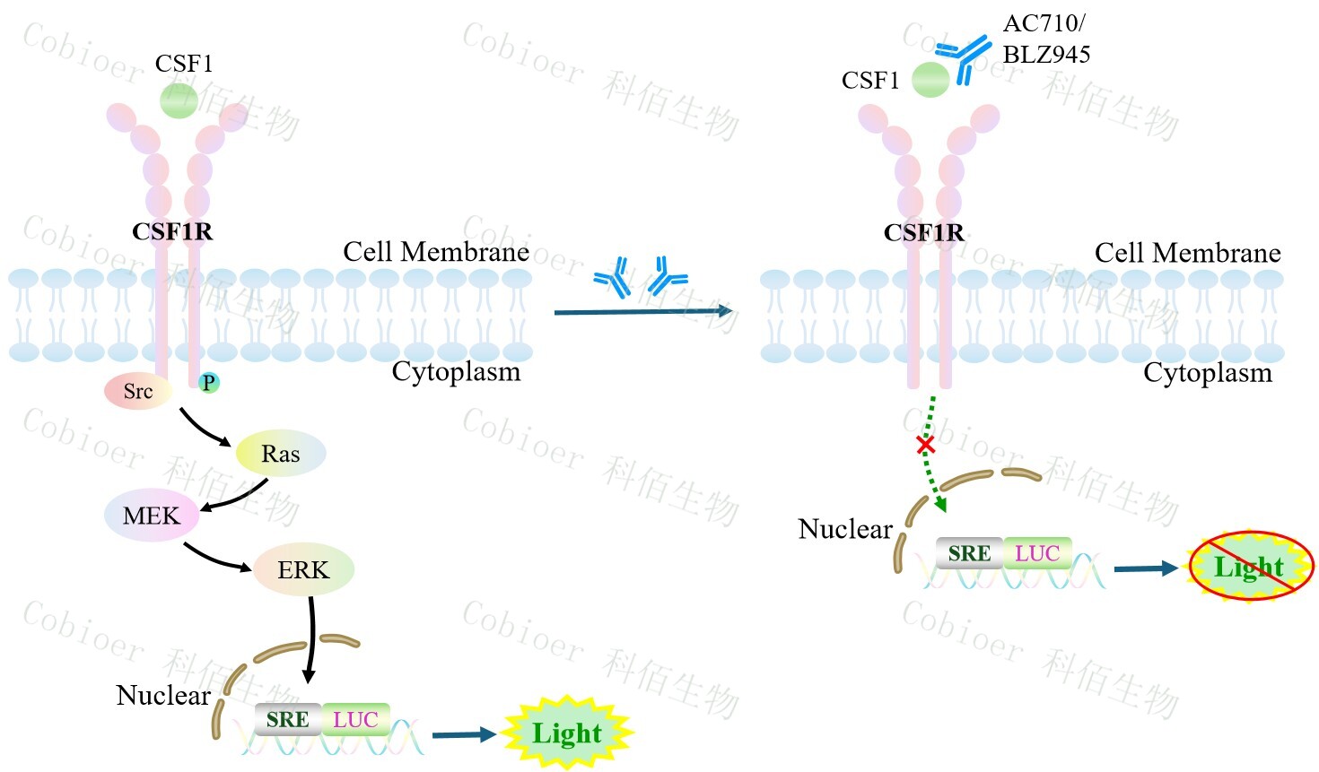 CSF1R SRE-Luc HEK293 報告基因藥靶模型很好的模擬了體內 CSF1 的信號轉導過程, 原理見下圖所示。 Figure 1. CSF1R SRE-Luc HEK293 細胞模型原理圖
