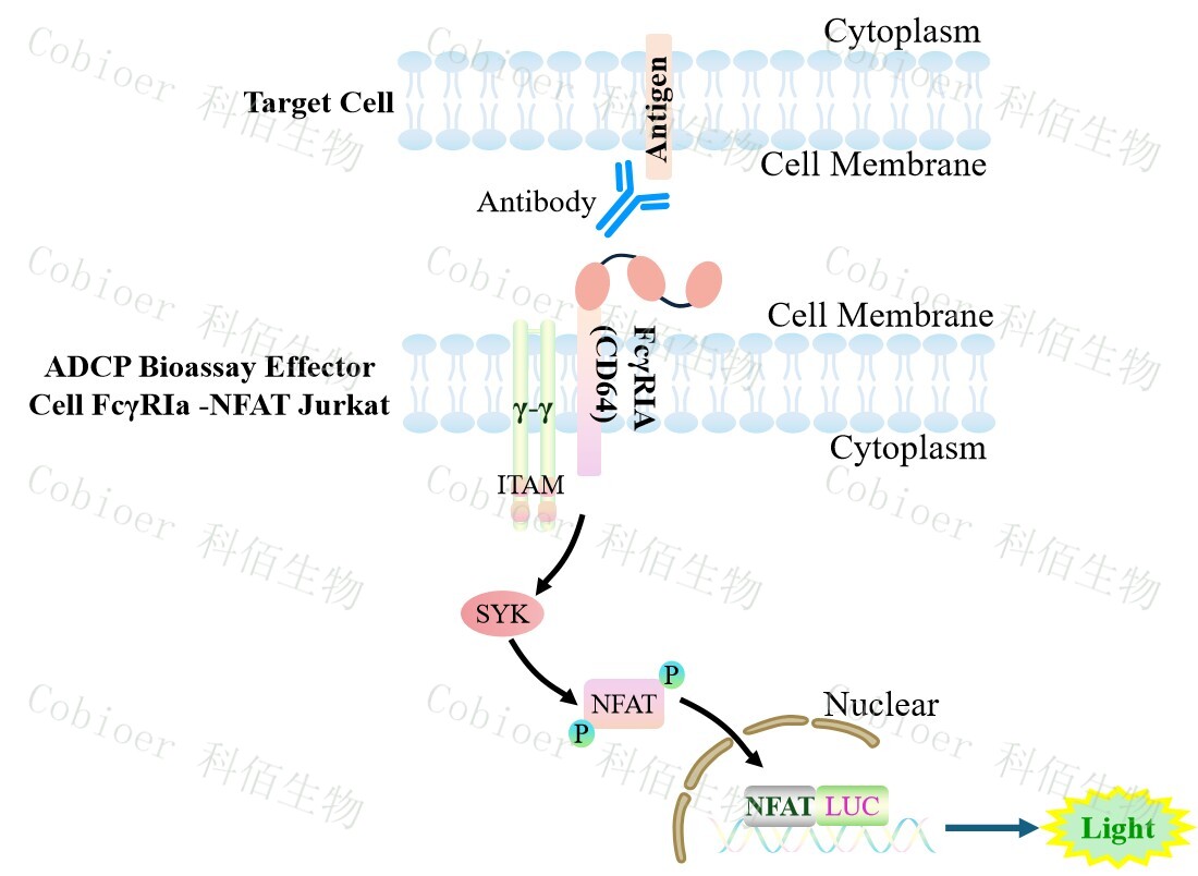 ADCP Bioassay Effector Cell FcγRIa -NFAT Jurkat 報告基因藥靶模型很好的模擬了體內(nèi) ADCP 的信號轉(zhuǎn)導過程,原理見下圖所示。