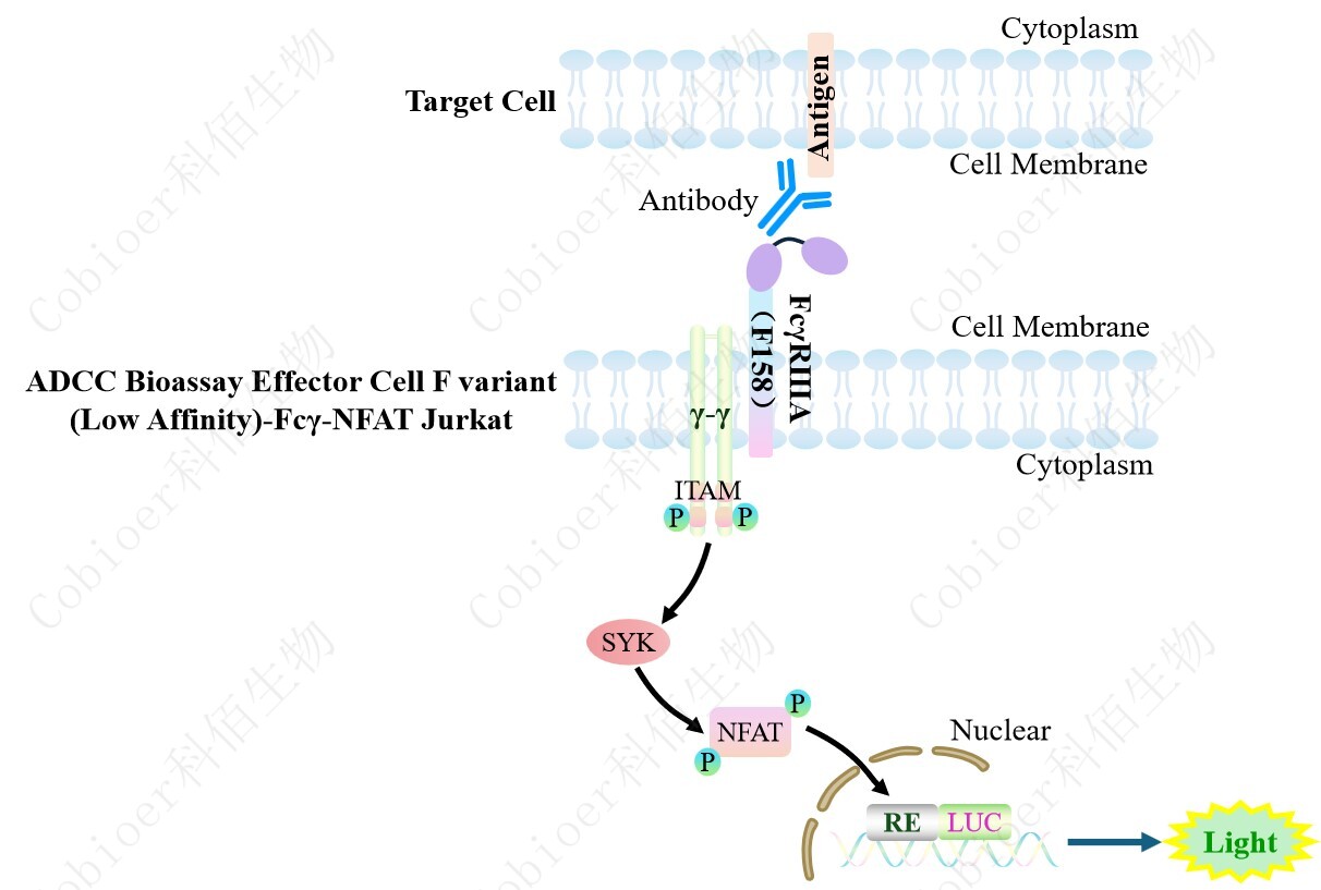 Figure  1. ADCC Bioassay Effector Cell F variant (Low Affinity)-Fcγ-NFAT Jurkat 細(xì)胞模型原理圖