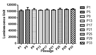Figure. Stablity test results. LNCAP-Luc cells showed at least 32 passage stability with similar luminescence unit.