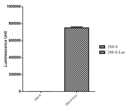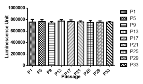 Figure. Stablity test results. 266-6-Luc cells showed at least 32 passage stability with similar luminescence unit. |