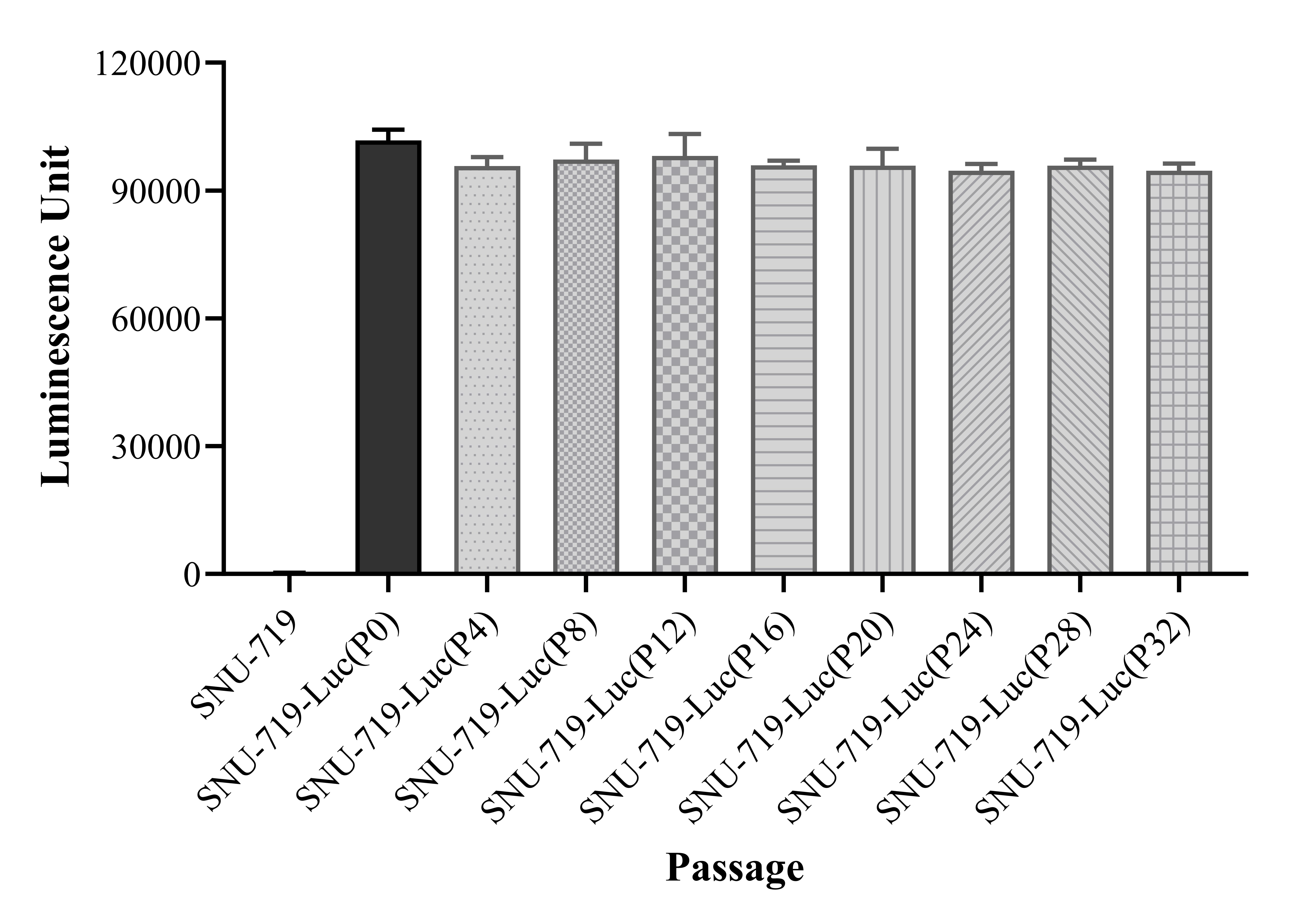 Figure 1. Stablity test results. SNU-719-Luc showed at least 32 passage stability with similar luminescence unit.