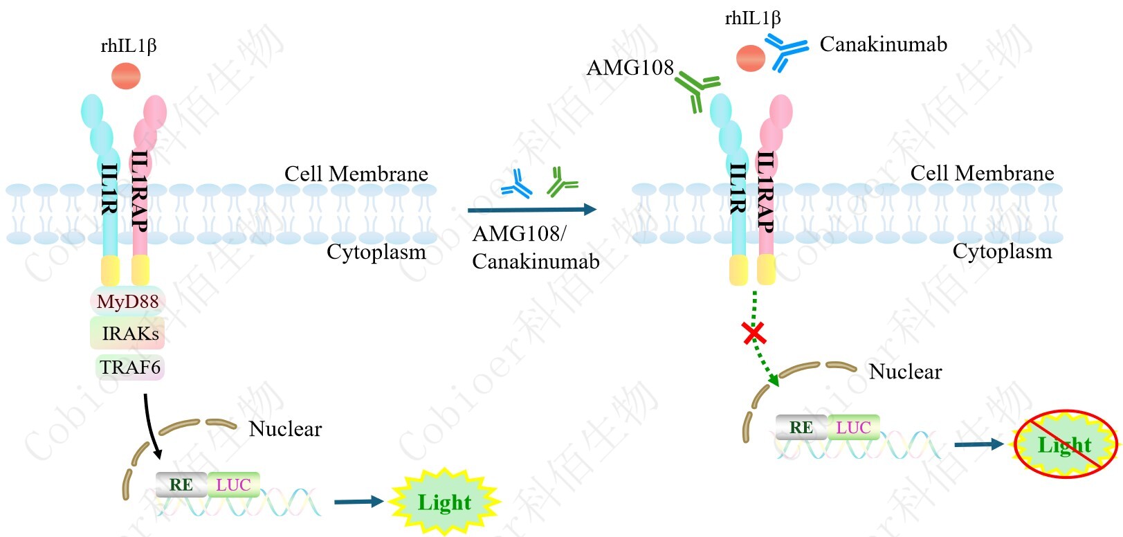 IL1 Effector Reporter Cell 報告基因藥靶模型很好的模擬了體內 IL1 的信號轉導過程, 原理見下圖所示。