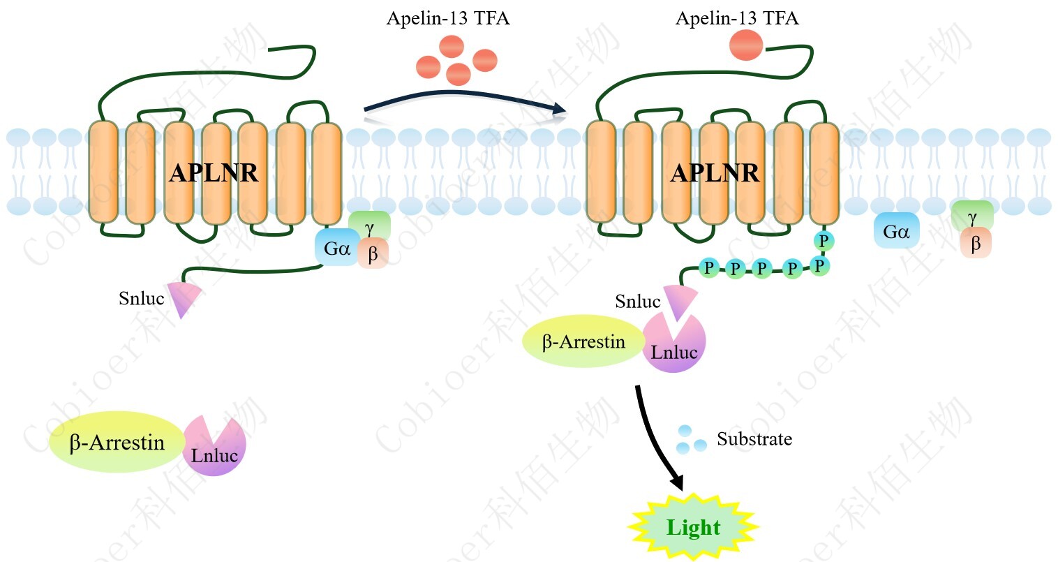 APLNR(APJ) β-Arrestin CHO 報(bào)告基因藥靶模型很好的模擬了體內(nèi) APLNR(APJ) /β-Arrestin 的信號轉(zhuǎn)導(dǎo)過程,原理見下圖所示。當(dāng)缺乏配體刺激時(shí),β-Arrestin 不與 APLNR (APJ)結(jié)合,融合β-Arrestin 的熒光素酶處于失活構(gòu)象,當(dāng) APLNR(APJ)遭遇配體刺激 時(shí),融合熒光素酶報(bào)告基因的β-Arrestin 被招募,使熒光素酶報(bào)告基因處于激活狀態(tài),加入 其底物后發(fā)光信號增強(qiáng)。![]() Figure 1. APLNR(APJ) β-Arrestin CHO 細(xì)胞模型原理圖 |