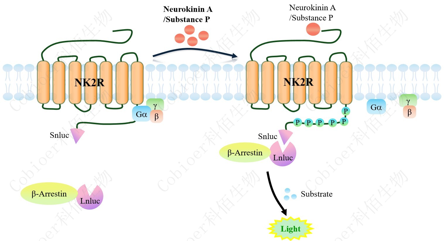 NK2R β-Arrestin CHO 報(bào)告基因藥靶模型很好的模擬了體內(nèi) NK2R/β-Arrestin 的信號(hào)轉(zhuǎn) 導(dǎo)過程,原理見下圖所示。當(dāng)缺乏配體刺激時(shí),β-Arrestin 不與 NK2R 結(jié)合,融合β-Arrestin 的熒光素酶處于失活構(gòu)象,當(dāng) NK2R 遭遇配體刺激時(shí),融合熒光素酶報(bào)告基因的β-Arrestin 被招募,使熒光素酶報(bào)告基因處于激活狀態(tài),加入其底物后發(fā)光信號(hào)增強(qiáng)。