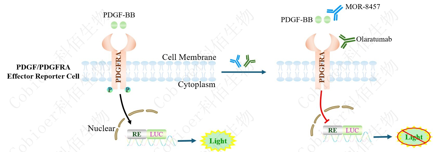 PDGF/PDGFRA Effector Reporter Cell 報告基因藥靶模型很好的模擬了體內(nèi) PDGFRA 的信號轉(zhuǎn)導(dǎo)過程,原理見下圖所示。
