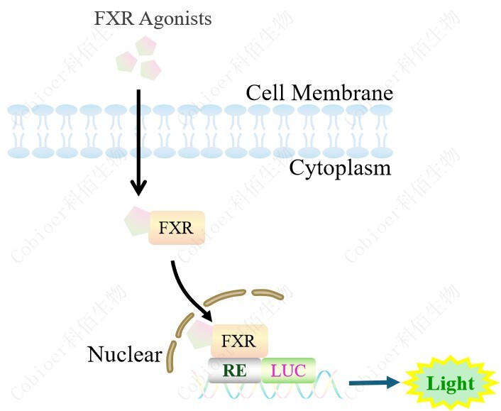 FXR Reporter Cell 報告基因細胞,在由調(diào)控因子調(diào)控并表達報告基因的 重組細胞上,穩(wěn)定表達人 FXR。CDCA,GW4064 和 WAY-362450 是 FXR 的激活劑,原理見下圖所示。![]() Figure 1. FXR Reporter Cell 細胞原理示意圖 |