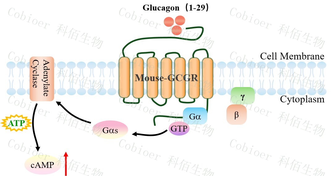 cAMP 在 G 蛋白偶聯(lián)受體(GPCR)信號轉導中是一種關鍵的第二信使。當配體結合到 GPCR,構象發(fā)生變化,激活受體接著激活 G 蛋白,Gs 的激活導致腺苷酸環(huán)化酶調控 cAMP 的升高。Mouse GCGR CHO 藥靶模型很好的模擬了體內 GCGR 的信號轉導過程,原理見下圖所示。![]() Figure 1.Mouse GCGR CHO 細胞模型原理圖