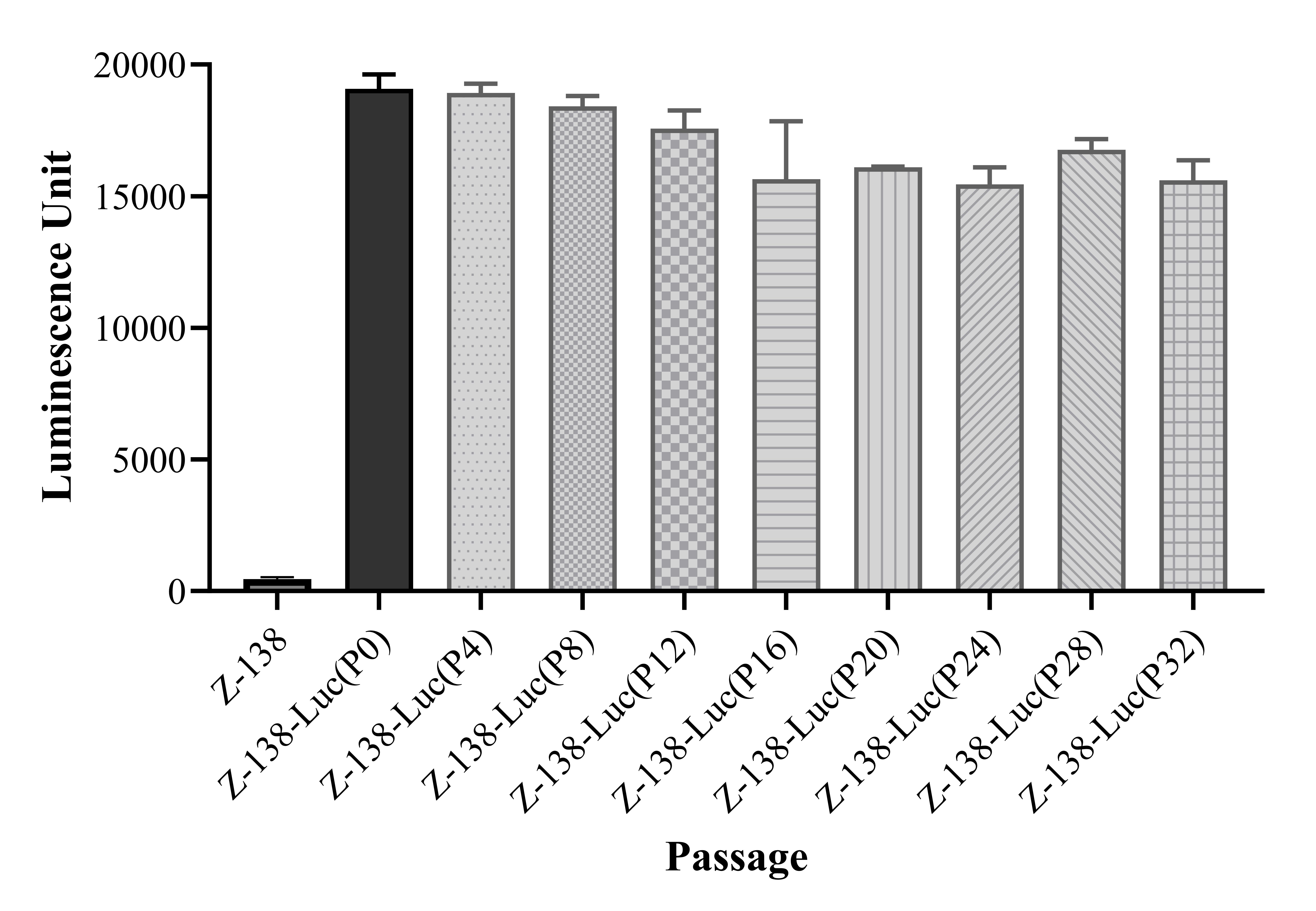 Figure 1. Stablity test results. Z-138-Luc showed at least 32 passage stability with similar luminescence unit. |
