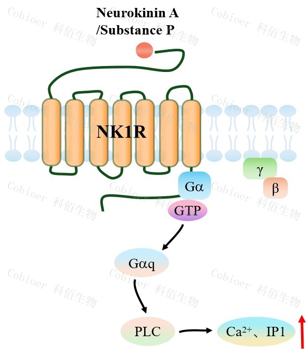 速激肽(Tachykinins )是分布在哺乳動(dòng)物中樞和周圍神經(jīng)系統(tǒng)中的一類神經(jīng)肽。速激 肽物質(zhì) P(SP)、神經(jīng)激肽 A(NKA)和神經(jīng)激肽 B(NKB)共享一個(gè)保守的 C 端基序, 對(duì)速激肽受體(NK1R、NK2R 和 NK3R)的激活至關(guān)重要。NKA 優(yōu)先激活與 Gα偶聯(lián)的 NK2R,而 SP 和 NKB 分別優(yōu)先結(jié)合 NK1R 和 NK3R。三種速激肽都能夠在所有速激肽受 體類型中表現(xiàn)為完全激動(dòng)劑。 NK1R(Neurokinin 1 Receptor),又稱 TACR1,是速激肽受體家族的核心成員,其內(nèi) 源性配體為 P 物質(zhì)(Substance P)。 |