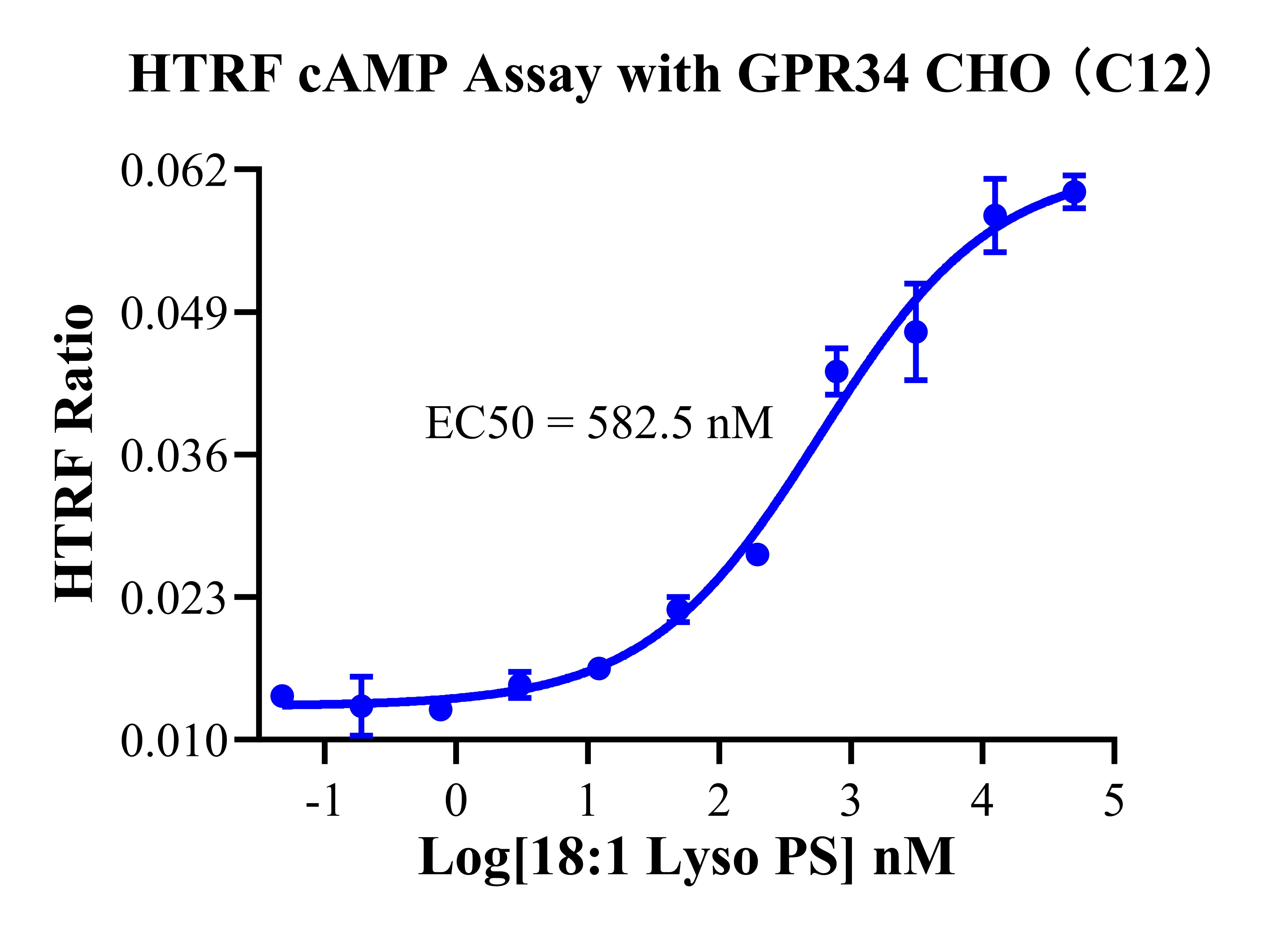 cAMP 在 G 蛋白偶聯(lián)受體(GPCR)信號轉(zhuǎn)導(dǎo)中是一種關(guān)鍵的第二信使。當(dāng)配體結(jié)合 到 GPCR,構(gòu)象發(fā)生變化,激活受體接著激活 G 蛋白,Gi 的激活導(dǎo)致腺苷酸環(huán)化酶調(diào)控 cAMP 的下調(diào)。GPR34 CHO 藥靶模型很好的模擬了體內(nèi) GPR34 的信號轉(zhuǎn)導(dǎo)過程,原理見下圖所示。![]() Figure 1. GPR34 CHO 細(xì)胞模型原理圖 |