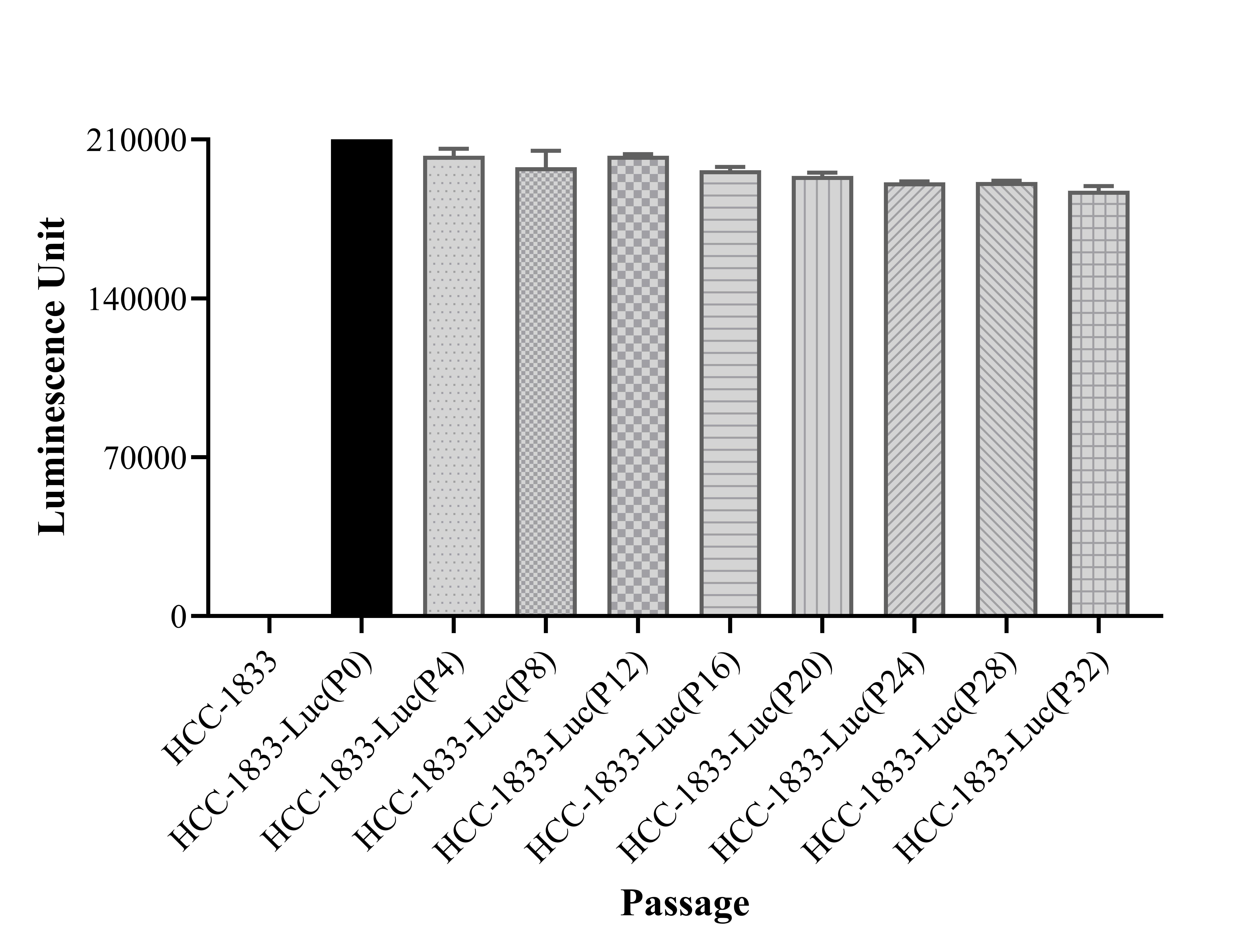 Figure 1. Stablity test results. HCC-1833-Luc showed at least 32 passage stability with similar luminescence unit.