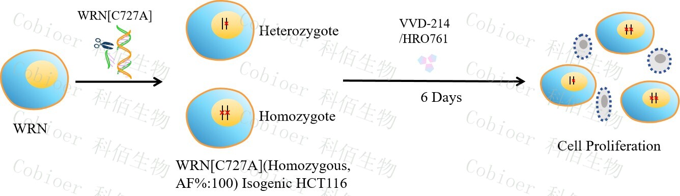 WRN[C727A](Homozygous,AF%:100) Isogenic HCT116 藥靶細(xì)胞,通過 基因編輯的方式將 WRN 的 727 位氨基酸胱氨酸(C)突變?yōu)楸彼幔ˋ)。![]() Figure 1. WRN[C727A](Homozygous,AF%:100) Isogenic HCT116 原理示意圖 |