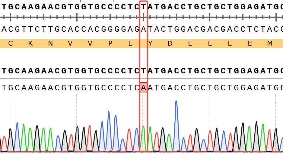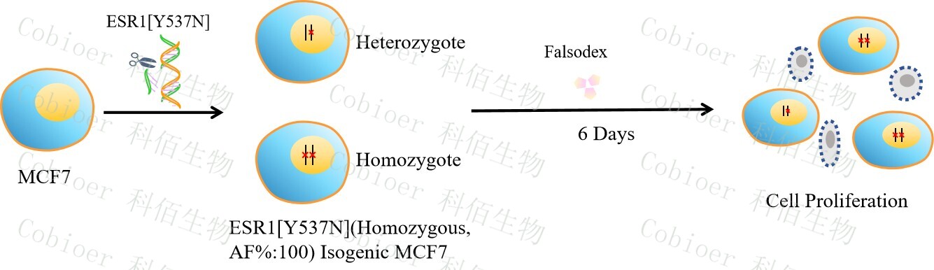 ESR1[Y537N](Homozygous,AF%:100) Isogenic MCF7 藥靶細(xì)胞,通過(guò)基 因編輯的方式將 ESR1 的 537 位氨基酸酪氨酸(Y)突變?yōu)樘於0罚∟)。![]() Figure 1. ESR1[Y537N](Homozygous,AF%:100) Isogenic MCF7 原理示意圖 |
