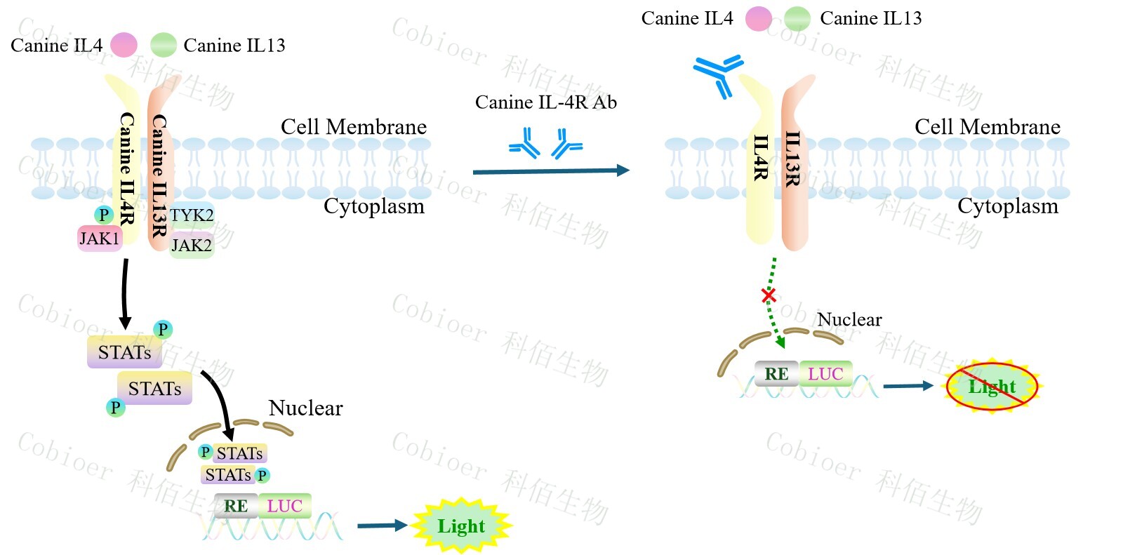 Canine IL4/IL13 Dual Effector Reporter Cell 報告基因藥靶模型很好的模擬了體內(nèi) IL4/IL13 的信號轉(zhuǎn)導(dǎo)過程,原理見下圖所示。![]() Figure 1. Canine IL4/IL13 Dual Effector Reporter Cell 細(xì)胞模型原理圖 |