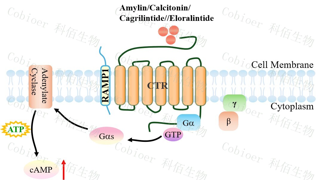 胰淀素(Amylin)受體的三種類(lèi)型的已被確定,即 AMY1,AMY2 和 AMY3。胰淀素 受體屬于 B 類(lèi) GPCR,是異二聚體復(fù)合物,由降鈣素受體(CTR)與受體活性修飾蛋白 (RAMPs)結(jié)合形成。該受體的 CTR 組分具有相同的 GPCR 結(jié)構(gòu):7 個(gè)跨膜相互連接的α- 螺旋,將細(xì)胞外信號(hào)傳遞到細(xì)胞內(nèi)細(xì)胞質(zhì)信號(hào)級(jí)聯(lián)。RAMP 有三種類(lèi)型(RAMP1、 RAMP2 和 RAMP3),它們共享 31%的氨基酸序列,具有相似的基本結(jié)構(gòu)。RAMP 是將 CTR 轉(zhuǎn)運(yùn)到細(xì)胞膜并調(diào)節(jié)其配體特異性的重要肽,它可以改變特定 GPCR 的藥理學(xué)、功能 和細(xì)胞運(yùn)輸。