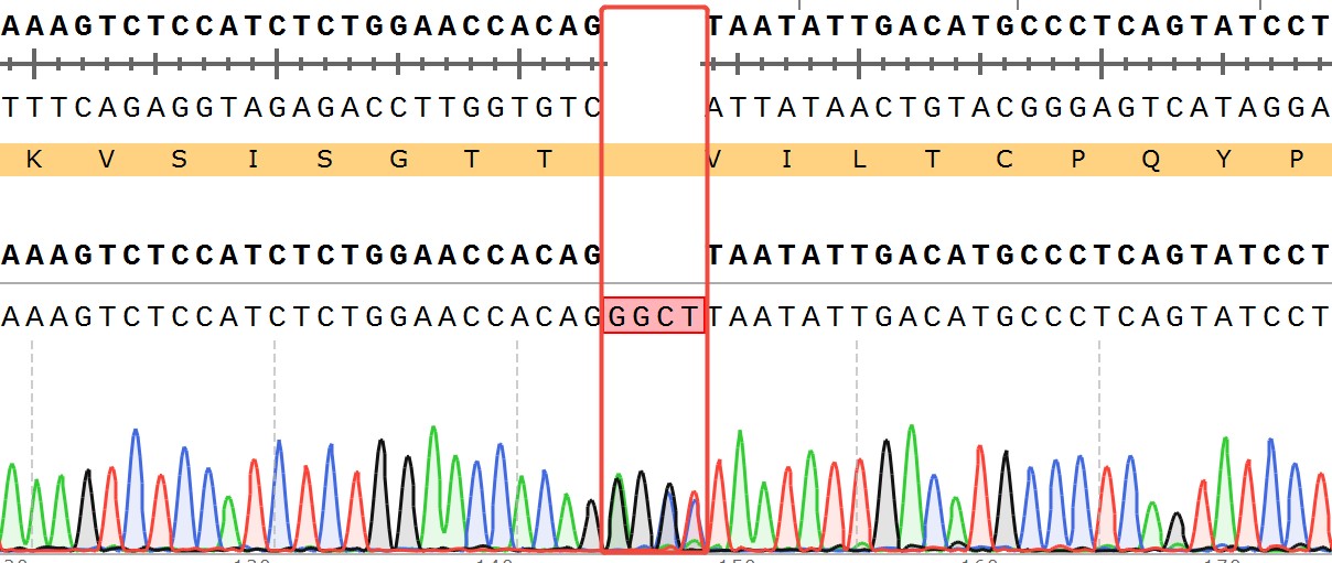 Figure 1. CD3E KO Jurkat 細胞測序驗證結果[CD3E(NM_000733.4):c.133_134insGGCT/CD3E:p.V45Gfs*13]