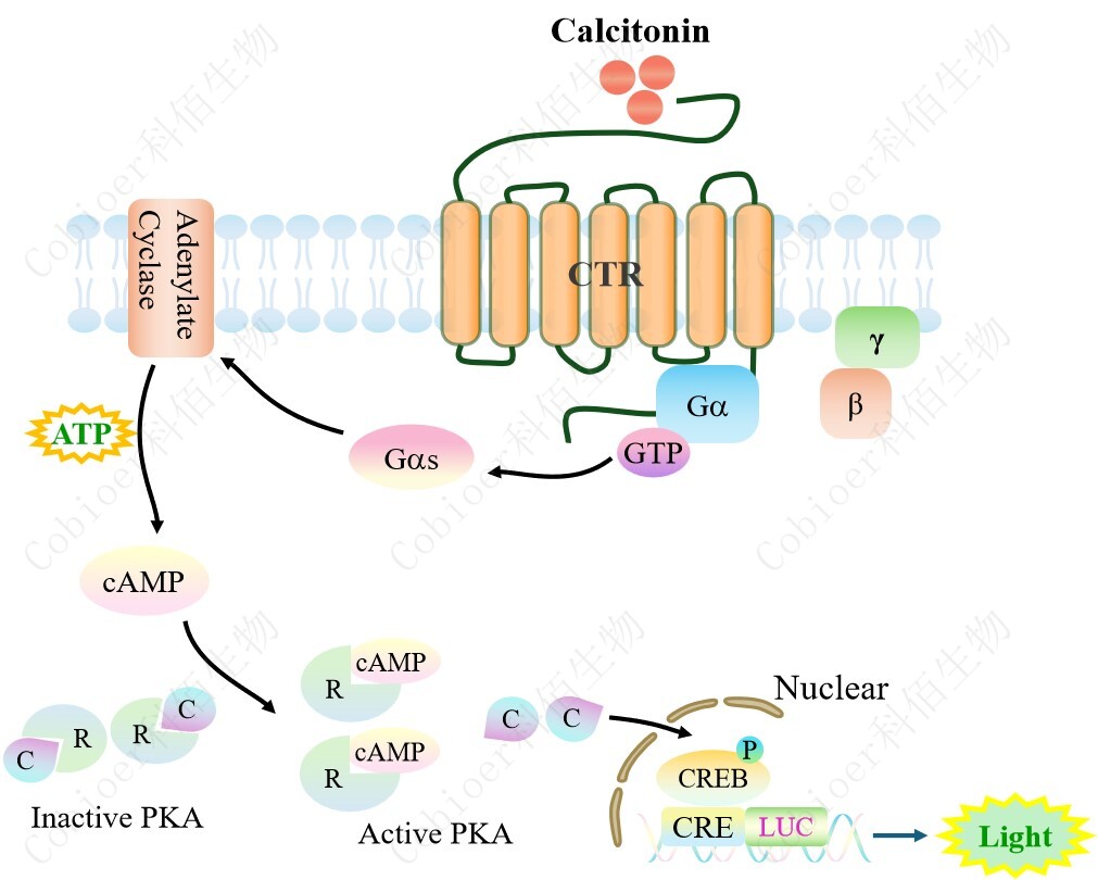 CTR(CALCR) CRE-Luc HEK293 報告基因藥靶模型很好的模擬了體內(nèi) CTR 的信號轉(zhuǎn)導(dǎo)過程,原理見下圖所示。![]() Figure 1. CTR(CALCR) CRE-Luc HEK293 細胞模型原理圖 |