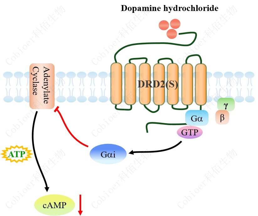 多巴胺(DA)是一種主要的兒茶酚胺神經(jīng)遞質(zhì),它與多巴胺受體(DRs)結(jié)合,因此 在中樞神經(jīng)系統(tǒng)(CNS)中起著重要作用,包括睡眠、工作記憶、情緒、學(xué)習(xí)等。DRs 是 由 DRD1、DRD2、DRD3、DRD4 和 DRD5 組成的 G 蛋白偶聯(lián)受體,根據(jù)它們對(duì)腺苷酸環(huán) 化酶(AC)活性的不同調(diào)節(jié)作用,分為 D1 樣受體(DRD1 和 DRD5)和 D2 樣受體 (DRD2、DRD3 和 DRD4)。D2 樣受體與 Go 和 Gi 蛋白偶聯(lián),它們參與 AC 的失活,導(dǎo) 致胞質(zhì)內(nèi) cAMP 水平降低。DA 與 D2 樣受體的結(jié)合抑制 cAMP/PKA 信號(hào)通路,最終影響 CREB 磷酸化。DRD2 基因有兩種剪接體,可產(chǎn)生不同長度(氨基酸數(shù))的受體,稱為 DRD2L 和 DRD2S。 | |