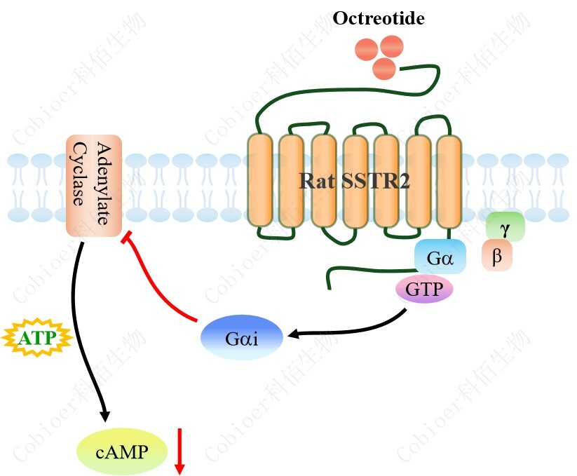 cAMP 在 G 蛋白偶聯(lián)受體(GPCR)信號(hào)轉(zhuǎn)導(dǎo)中是一種關(guān)鍵的第二信使。當(dāng)配體結(jié)合 到 GPCR,構(gòu)象發(fā)生變化,激活受體接著激活 G 蛋白,Gi 的激活導(dǎo)致腺苷酸環(huán)化酶調(diào)控 cAMP 的下調(diào)。Rat SSTR2 CHO 藥靶模型很好的模擬了體內(nèi) SSTR2 的信號(hào)轉(zhuǎn)導(dǎo)過程,原理 見下圖所示。