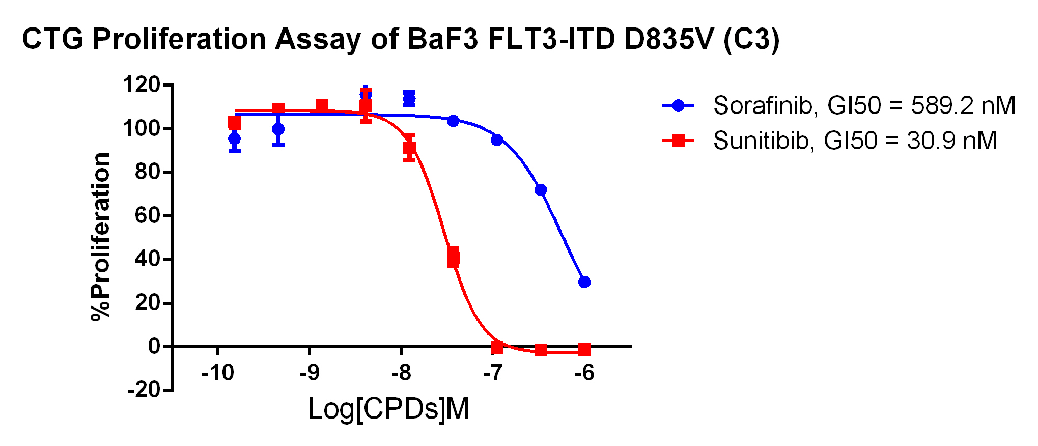 Figure . Anti-proliferation assay of two reference compounds on the FLT3-ITD [D835V]/BaF3 Stable Cell Line. |