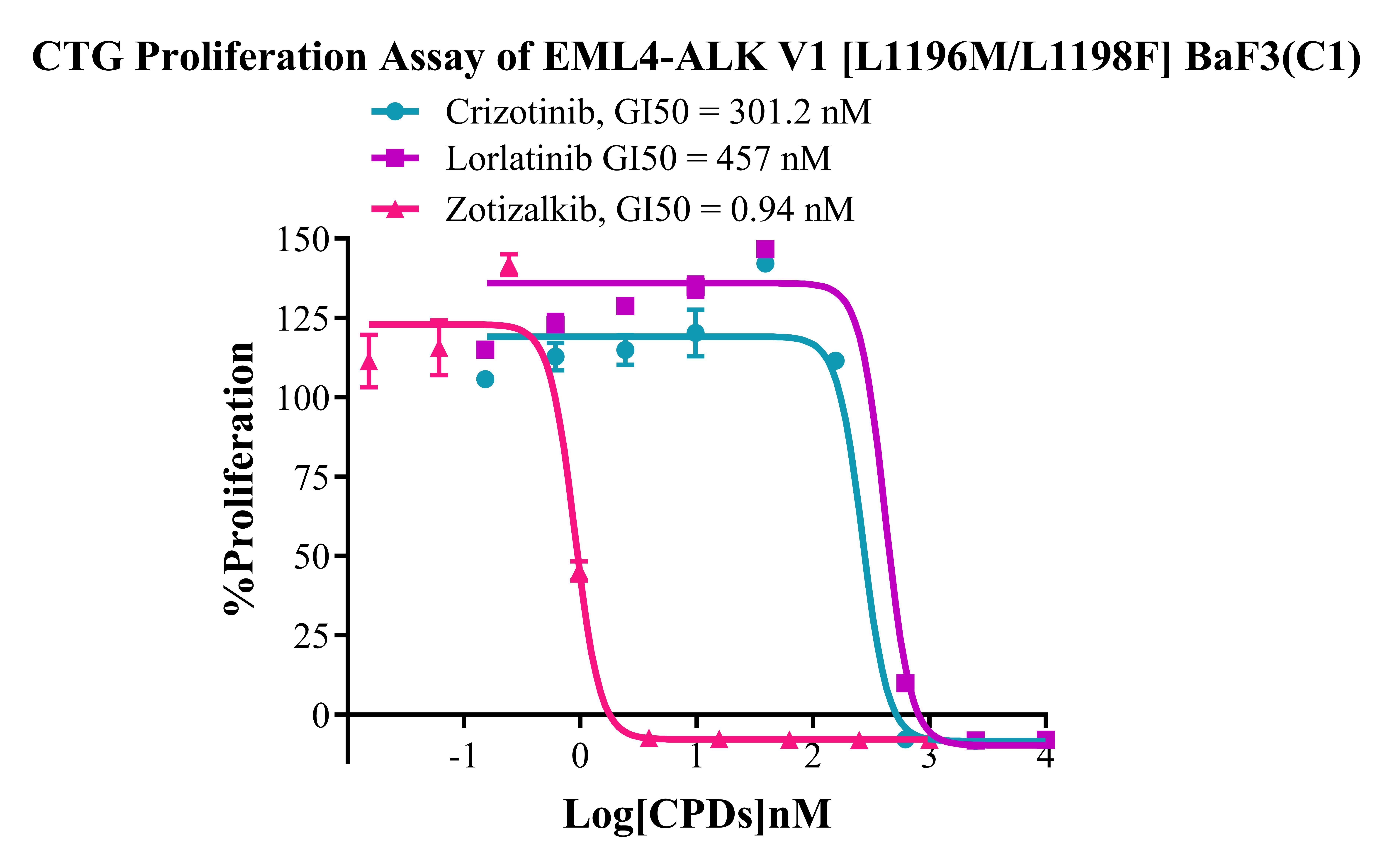 Figure 4. CTG Proliferation Assay of EML4-ALK V1 [L1196M/L1198F] BaF3(C1).
