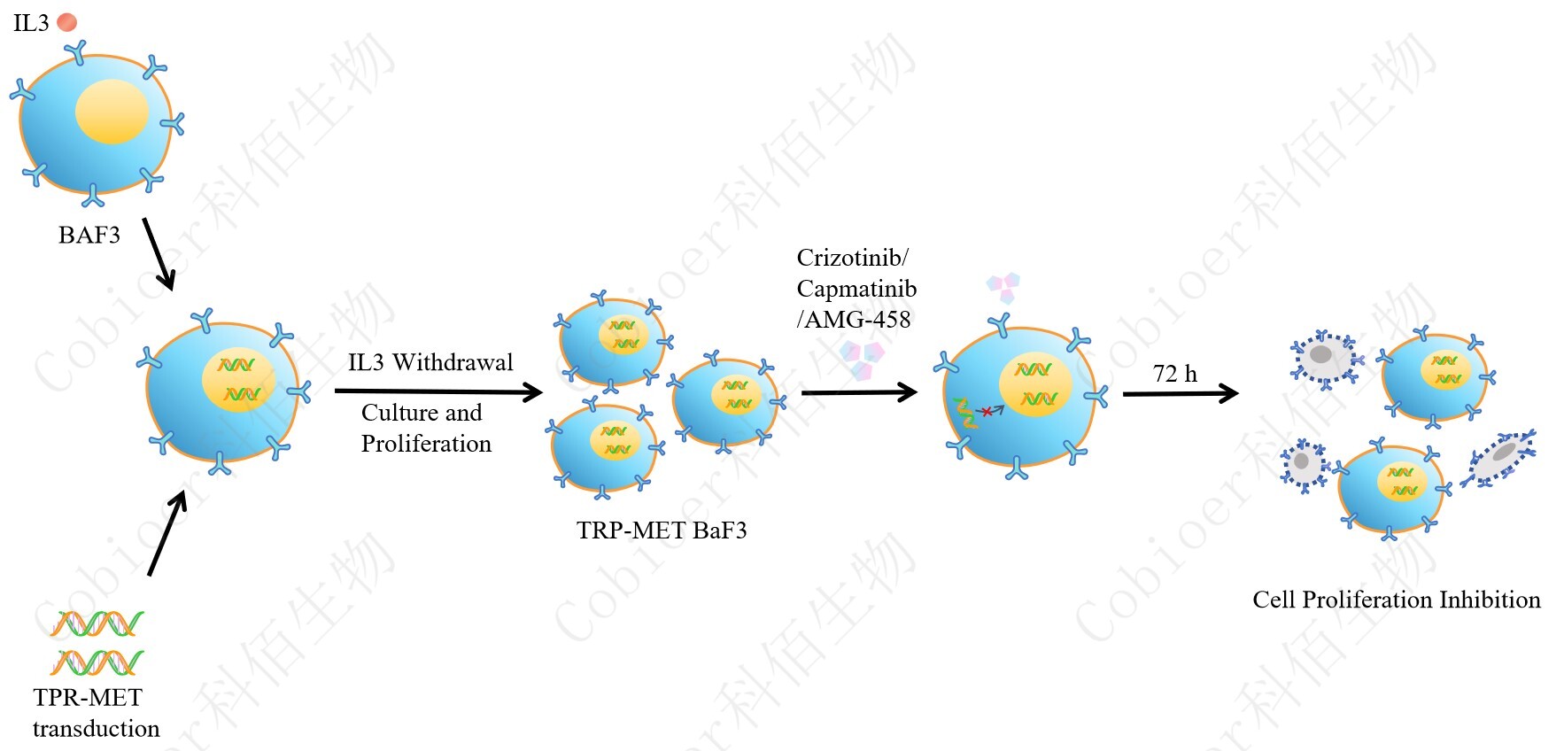 BaF3(小鼠原 B 細(xì)胞)的生長(zhǎng)和增殖需要 IL-3 的維持。通過引入各種表達(dá)激酶的基因, 能作為 BaF3 的驅(qū)動(dòng)基因,讓 BaF3 不再依賴 IL-3 而增殖,進(jìn)而激酶基因成為 BaF3 增殖依 賴的驅(qū)動(dòng)基因,用于評(píng)估小分子藥物對(duì)激酶的靶向抑制作用,原理及流程見下圖所示。![]() Figure 1. TPR-MET BaF3 細(xì)胞的構(gòu)建原理圖 |