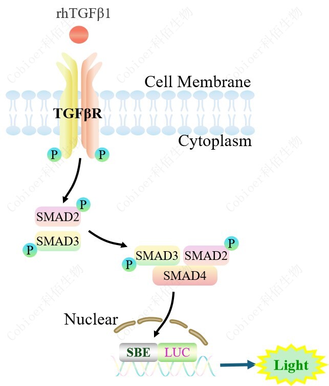 SBE-Luc HEK293 報(bào)告基因細(xì)胞,是由 SBE 調(diào)控并表達(dá) Luc 熒光素酶報(bào) 告基因的 HEK293 細(xì)胞。TGF-β與受體結(jié)合,激活 SBE 的原理見下圖所示。
